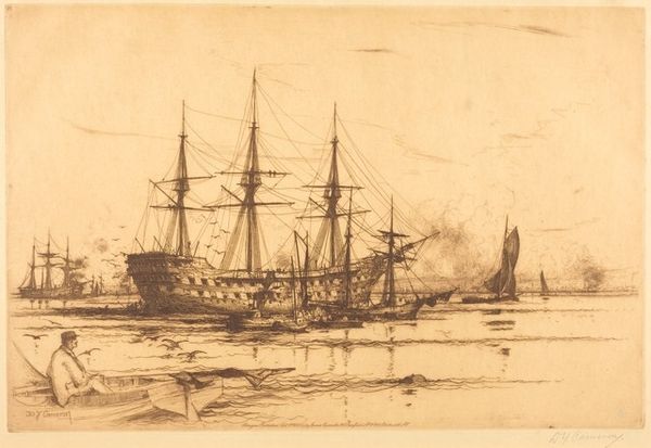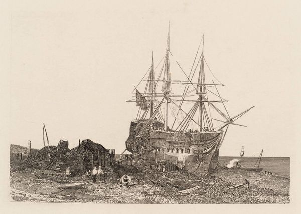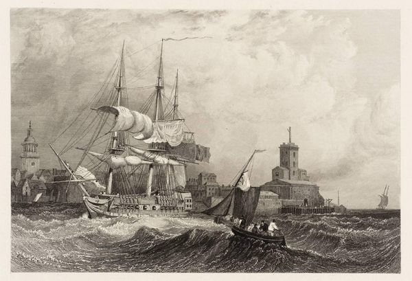 Editor: So this is Clarkson Stanfield's "The Semaphore, Portsmouth," an engraving of an image in the Tate. It feels so detailed, almost overwhelming. What do you make of it? Curator: Isn't it wonderful? It reminds me of being a kid and building model ships. The lines pull you in, don't they? Stanfield clearly knew his ships, but he also captures the sheer energy of Portsmouth. Does the detail distract, or does it add to the sense of place, do you think? Editor: I think it adds, definitely. I hadn't really considered the sense of place until now. Curator: Exactly! And it's not just a visual record; it's a feeling, a breath of salty air, a moment in time meticulously rendered. I learn something new every time I look at it. Editor: Me too, especially about seeing a place through art.