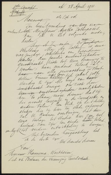 Editor: Here we have "Brief aan Philip Zilcken," potentially from 1913, by Charles van Wijk. It's ink on paper, a handwritten letter, almost like a pen sketch in its fluidity. The mood feels intimate and personal, don't you think? What strikes you about this piece? Curator: What I see is a trace of a specific historical moment. Think about the act of writing a letter then. It signifies a different kind of relationship to time, communication, and even intimacy than we experience today. We see handwriting itself becoming a form of visual expression. Editor: Right, it's not just the content of the letter, but the visuality of it as well. How does the historical context inform your understanding? Curator: The early 20th century was a period of intense social and political upheaval, with anxieties surrounding industrialization and shifting class structures. Letters like this offer glimpses into personal networks and intellectual exchanges. The handwriting itself may reflect the writer’s identity and social positioning. Consider what it meant to communicate in this way versus a telegram or face to face, and how it reinforces privilege for those who were literate. What is he even saying in the letter? Editor: According to the transcription, he's thanking someone, discussing someone's candidacy and mentioning Amsterdam. He also talks about some membership. Curator: Exactly. While seemingly mundane, these details give clues. This could represent how artists and intellectuals navigated their professional and personal lives. Perhaps these 'pogingste venturendy' hinted at anxieties about an unknown future for the recipient of this brief. Does that add a different feeling to this artifact? Editor: It definitely adds depth to what initially seemed like a simple note. It really highlights how the personal and the political are intertwined. Curator: Precisely. By examining these connections, we can gain a richer understanding of the complexities of the past and their relevance to the present. I now see something I did not see before; thank you.