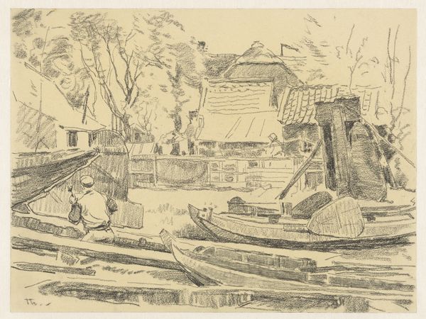 Editor: So, this is "Boerderij bij de Waalsdorperweg," or "Farm near Waalsdorperweg," by Johannes Bosboom, sometime between 1827 and 1891. It's a drawing using pencil and pen. I find the sketchiness quite charming, but I am unsure where to begin with interpreting it. What stands out to you most in terms of its composition? Curator: Initially, the asymmetrical arrangement of forms arrests the eye. The stark contrast between the clustered, almost overgrown, left side and the sharp angles of the barn structure on the right generates a palpable tension. Notice how the varying densities of pencil strokes articulate space. Where do you see evidence of artistic choices that seem deliberately structured, rather than merely representational? Editor: I see it in the way the light seems to catch on the roofs. The strong diagonal lines of the main building lead my eye to the centre and then the density of foliage on the left creates depth but seems very deliberate. How does this deliberate contrast inform our understanding of the piece? Curator: It introduces a play between the man-made and the natural. Bosboom sets up a visual dialogue, not just through subject matter but through the very application of the medium. The formal elements—line, value, texture—become actors in a semiotic drama. Is this balance between elements pleasing or unsettling? Editor: I think the composition leans slightly towards the unsettling, the darkness feels like the encroaching wild overwhelming the farm itself. It's subtle, though. So, essentially, Bosboom isn't just representing a landscape. He’s constructing an argument through form and composition. Curator: Precisely. By focusing on the visual mechanics, we gain insight into Bosboom's deeper intentions. This analysis moves beyond mere depiction towards deciphering a visual language, and its emphasis on artistic style adds significant complexity. Editor: This new viewpoint gives me a richer appreciation of the artist's technique and a new approach for analyzing compositions and the tension the style is trying to convey. Thank you!