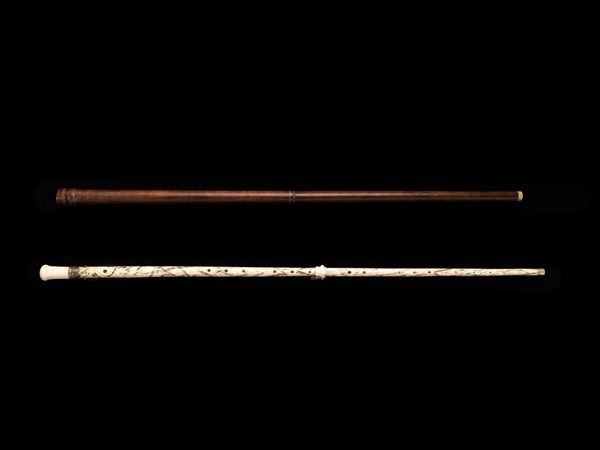 Curator: Before us is a striking carved wooden object, a Bird-head Club, also known as goporowaramaru, created around the 19th century. It's currently held in the collection of the Minneapolis Institute of Art. Editor: Its linear elegance belies a latent brutality. The polished wood glows warmly, yet the sharply pointed bird-head implies a purpose beyond mere display. Curator: Indeed. The piece invites inquiry into its form. Notice the smooth, cylindrical shaft flowing into that dramatic, almost beak-like projection. The craftsman has created a stunning transition. Editor: Birds have always been powerful symbols in numerous cultures. Considering its designation as a "club", this object could signify aggression, status, or even a connection to ancestral spirits associated with avian forms. Curator: A pertinent observation! Looking closely, the curve along the neck section is mirrored and elegantly balanced. Such careful symmetry reveals not just functionality but also a deep aesthetic awareness in its creation. Editor: Perhaps the avian imagery serves as a psychological element: the swiftness, the height, or freedom, all could be metaphorical extensions of the owner's power or intentions. The color, like dark blood. I imagine this item had a place in pre-battle ceremonies. Curator: Or perhaps its use was connected to ritual performance of any kind, violence or otherwise. The grain of the wood enhances the sense of streamlined motion. The smooth dark patina across the surfaces softens its shape while subtly catching highlights. Editor: Even if primarily utilitarian, it speaks volumes about the worldview of its creator and user. To me, it embodies the complex relationship between beauty, aggression, and spiritual beliefs so often blended into ritual tools. Curator: Exactly! The artist manipulated a single block of wood with incredible sophistication to develop a functional, elegant and symbolically rich artifact. Editor: An object which reminds us how functional forms become charged with profound symbolism that echoes across millennia.