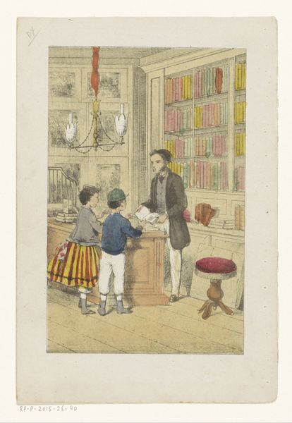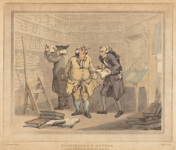 Editor: This is "Bookseller and Author" by Thomas Rowlandson, probably from 1784. It’s a print combining etching and watercolor on paper. I’m immediately struck by the caricature-like quality of the figures and how busy the composition feels. What do you see in this piece? Curator: Well, looking through a materialist lens, the layering of techniques - the etching providing a reproducible base and the watercolor adding unique tonal qualities – speaks to the burgeoning print market of the late 18th century and the demand for affordable art. Rowlandson wasn't just making art, he was manufacturing a commodity. Do you think the chosen materials democratized or cheapened the artistic process? Editor: That's interesting. I hadn't considered the "manufacturing" aspect. I suppose the printmaking allowed wider distribution, making it more accessible. But, does the reliance on print diminish the skill involved? Curator: Not necessarily diminish, but certainly redirect it. Consider the paper itself – its sourcing, the labor involved in its production. Rowlandson’s skill wasn't just in artistic creation but also in navigating and utilizing the existing infrastructure of production and consumption. How does that overcrowded bookshelf in the background speak to the burgeoning print market? Editor: It reinforces your point about accessibility and affordability through high production volume, indicating rising demand for the books being created at this time. All those spines, and a worker reaching for more copies up a ladder. The use of caricature to emphasize what is a market interaction helps deliver its satire to its viewers. Curator: Precisely. The labor and the materials of book production, along with their social circulation, are as crucial to understanding this artwork as the artistic "genius" of Rowlandson. This piece gives an interesting insight into Georgian era capitalism. Editor: This materialist reading has given me so much to think about in terms of production and access; it really transforms my understanding of the piece. Curator: Indeed, looking at the material and its production context illuminates the social landscape it reflects.