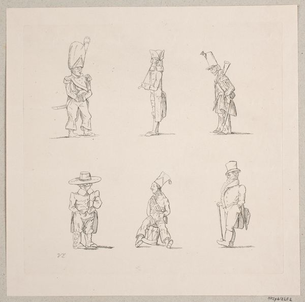 Editor: This is Henry William Bunbury's sketch, "Three Figures from a Harlequinade," and it's just so evocative. The figures feel both comical and slightly unsettling. What do you make of these characters and their potential story? Curator: Ah, yes. Consider the Harlequin figure with his slapstick, a potent symbol of mischief and agility, perpetually evading order. Do you see how he embodies the trickster archetype, a challenge to societal norms? Editor: Absolutely, and the other figures seem to represent opposing forces, maybe authority or chaos. Curator: Precisely. Their exaggerated features echo the tradition of Commedia dell'arte. Reflect on how the artist uses these figures to mirror our own inner struggles with freedom and constraint. Editor: It's amazing how much cultural history is embedded in a simple sketch! Curator: Indeed. Art is a window into the collective consciousness, revealing our shared narratives.