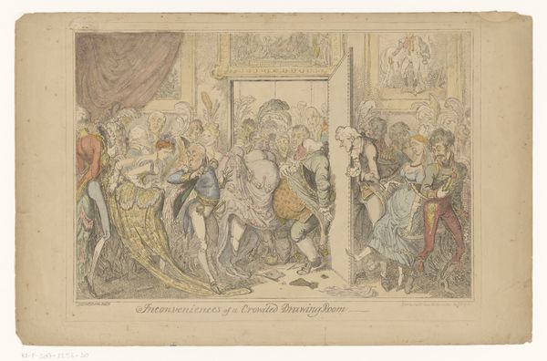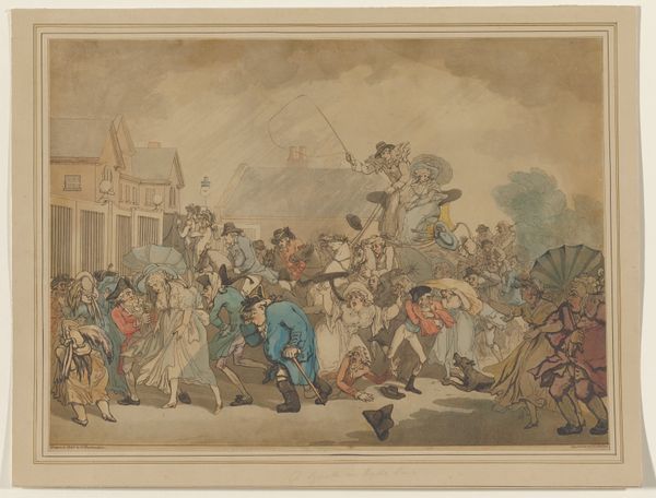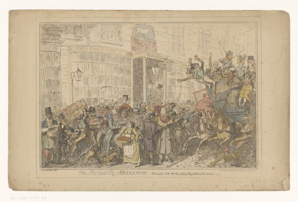 In the early nineteenth century, London overtook Beijing to become the largest city in the world. The resulting congestion made London streets not only slow but terribly noisy. Rowlandson drew a farcical scene of city traffic, with chaotic sidewalks and streets mobbed with people, construction mishaps, and a stream of colliding carriages. The horses rear, the drivers turn their wips on one another, and the passengers are in an uproar. The inscription points out that such ordeals "allow you at least an hour or more than you require to sharpen your wits for table talk."