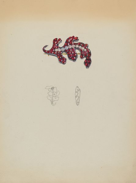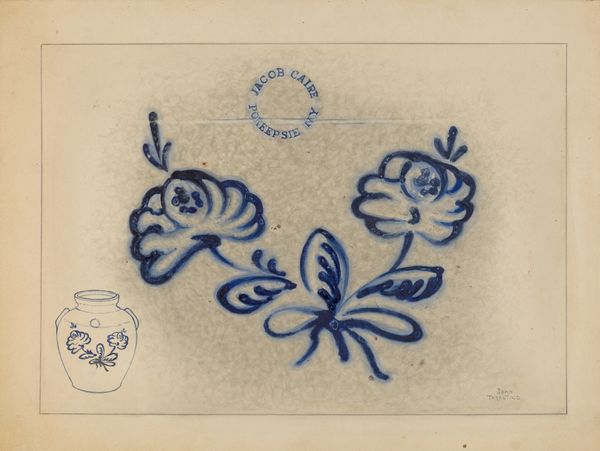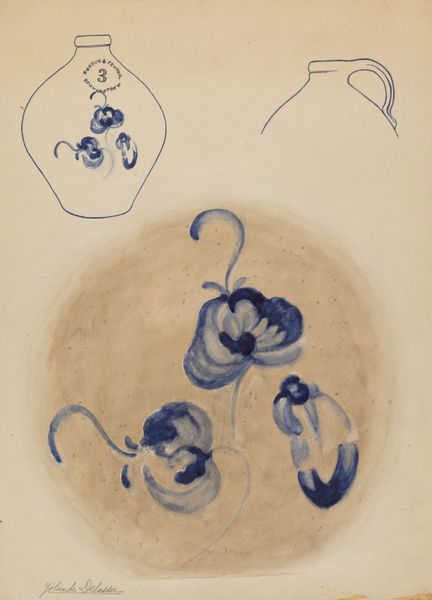 Editor: Here we have "Jar," a watercolor and ink drawing on paper from around 1937 by Yolande Delasser. There’s something very ghostly and dreamlike about it, especially with the muted palette. What do you see in this piece? Curator: Immediately, I see a blending of the utilitarian with the decorative, evoking a powerful sense of memory. The rendering of the jar itself feels almost like a template, yet it contains this potent floral pattern, repeated across the broader pictorial space. Consider the cultural role of the jar – a vessel, something that contains and preserves, not only physically, but also symbolically. What do you think the flowers represent? Editor: Well, the flowers on the jar, given their color and placement, feel traditional, but in the larger painting, the disembodied blue shapes hovering above feel untethered, even strange. It's like a deconstructed memory of the jar’s design. Curator: Precisely! They echo the flower motif yet depart from their initial context, becoming symbols floating in the subconscious. There's almost an anthropomorphic presence in these forms, reminiscent of folk-art traditions. Does this spark anything else for you, perhaps about utility versus aesthetics? Editor: That makes me think of how functional objects often become imbued with symbolic meaning over time, transforming into heirlooms. The artist highlights the floral decorations normally taken for granted and blows them up, turning the overlooked designs into something emotionally significant. Curator: Exactly! And that magnification, that visual emphasis, points to the persistence of cultural memory. By dissecting the object, the artwork emphasizes each layer of the symbol and invites viewers to acknowledge it through their own personal stories. Editor: So it is less about the literal jar and more about how repeated symbols hold collective memory. Thanks, I’ll certainly never look at everyday objects quite the same! Curator: And I appreciate you seeing beyond the surface to the symbolism inherent in even the most mundane designs.