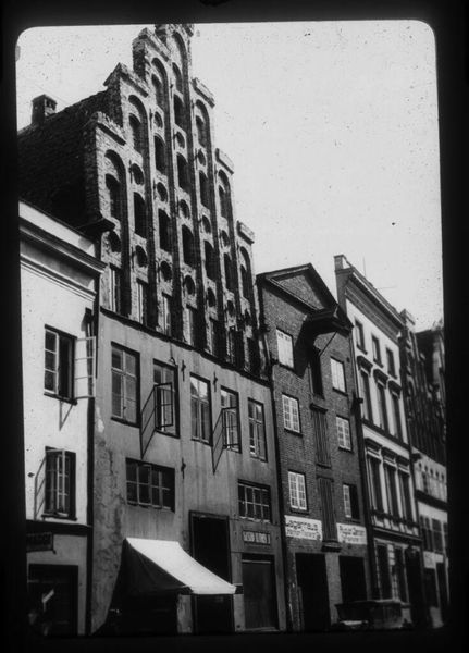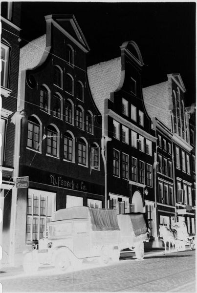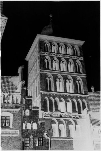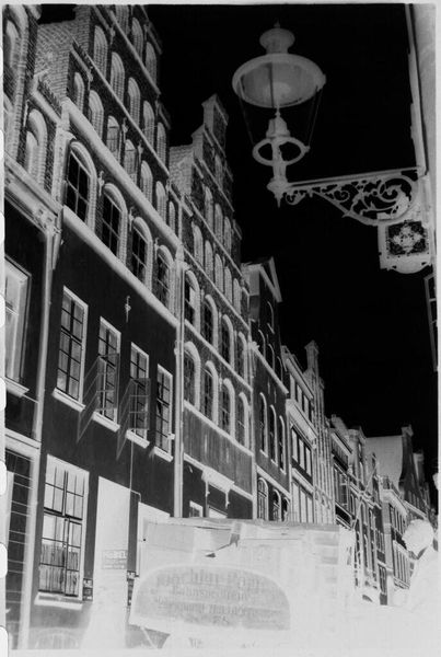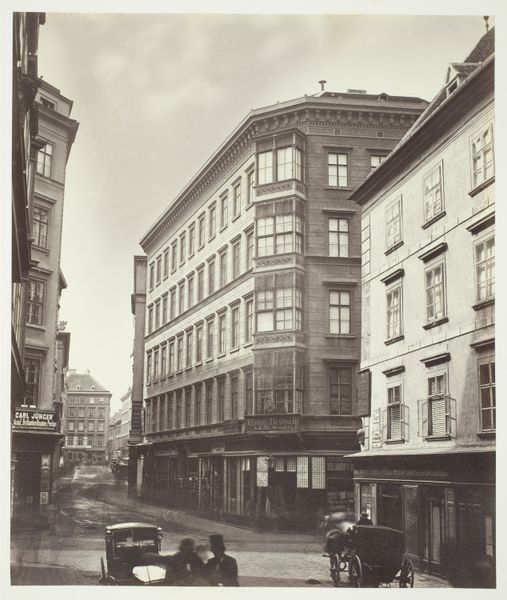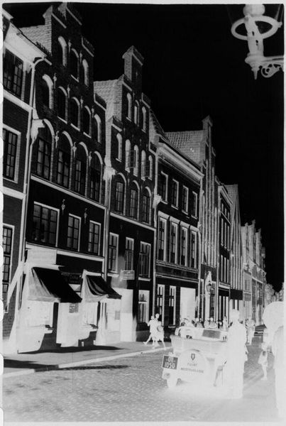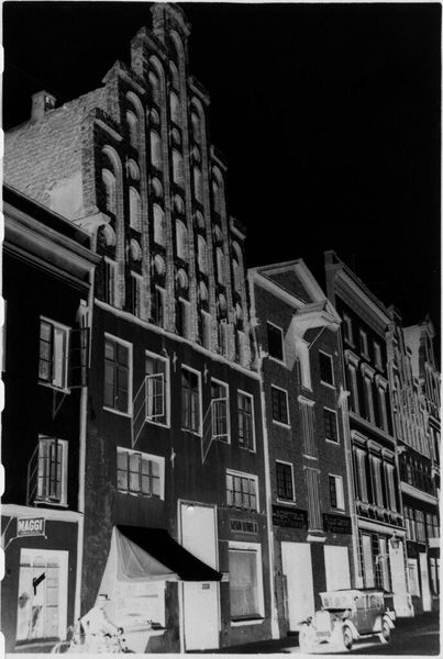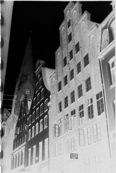 Curator: This is "Street scene, Lübeck," attributed to Laurence Feininger, an intriguing black and white image. Editor: It feels like a memory surfacing, a blend of stark lines softened by the photographic grain. Curator: The composition uses the architecture to create a strong vertical thrust, offset by the horizontal lines of the street and vehicles. Note the rhythm of the window placements, almost musical. Editor: I see a commentary on urban life, the contrast between the static buildings and the implied movement of commerce and transport. It makes me wonder about the socio-economic realities of Lübeck at the time. Curator: Indeed, there is an interesting interplay between surface and depth. The tonal range, though limited, provides texture to the architectural forms. Editor: For me, the photo speaks to the enduring nature of place, and the transient presence of individuals within it. A potent statement on temporality. Curator: An astute observation. The piece is ultimately, a well-considered arrangement of form and light. Editor: And a reminder of the stories embedded within the very structures that surround us.