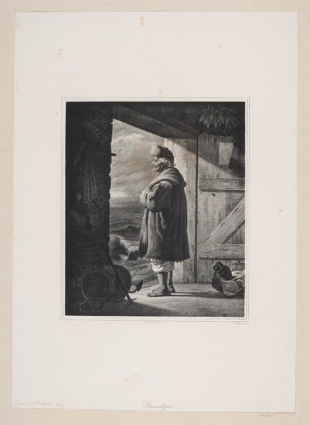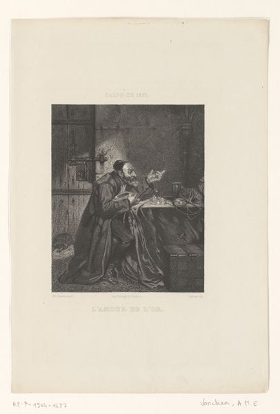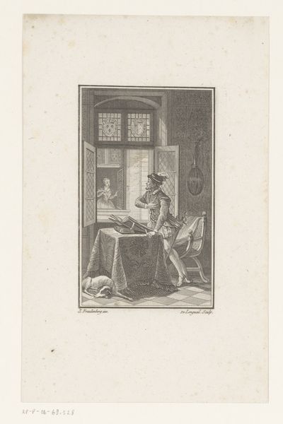 Curator: Hermanus Johannes van den Hout offers us this engraving called "Brieflezende vrouw en bierdrinkende man," likely created sometime between 1822 and 1845. It depicts a scene with two figures. Editor: The immediate impression is this calm, somewhat somber scene of daily life; the textures, even in this grayscale, suggest a rich materiality to their clothing and surroundings. It makes me want to imagine the sounds and the smells around this tavern table. Curator: Yes, and in terms of structure, observe how the artist uses contrasting figures—one engaged with text, the other with drink—to explore ideas of leisure and learning, juxtaposing contemplation with earthly enjoyment. The artist is asking us, perhaps, about the worth of each, you know? Editor: Precisely. We can analyze how the formal balance guides our eyes—from the sharp, clean lines defining the reader’s silhouette to the softer gradations detailing the drinker's form and shadows. Curator: It really speaks to how this engraving uses realism, but it's a flavored reality! Like Van den Hout picked up the camera from his time, but he's shooting film you know, playing with light, telling a little lie about the time. This little genre scene opens us up to the everyday rituals of its time... a history in ink. It seems like one wants to hear better news and the other just drink beer? And in a funny way the man with the beer seems better informed than the other. Editor: A very valid point. To view Van den Hout’s piece under the wider umbrella of his era's formal experimentations sheds new light on its narrative function. One begins to ponder what the artist wishes to convey and to discover how the content of his art adds to its aesthetic value. Curator: Exactly. Van den Hout provides us, not merely a genre painting, but a mirror reflecting back how people perceived everyday lives and experiences then—with a cheeky nod to history and character types! Editor: Conclusively, understanding both the overt theme and covert structure reveals so much regarding an epoch! I would find value returning and exploring Van den Hout’s entire oeuvre from now on.