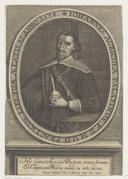 Curator: Ah, yes, “Portret Adam Adami,” sometime in the first half of the 18th century, engraved by Georg Daniel Heumann. It's quite the piece! What strikes you first? Editor: The intricacy of the engraved lines is incredible. There is this feeling of reverence or formality about it. Almost like, he is in memoriam. It really makes you wonder, though – what story do you think it's trying to tell, beyond just presenting a likeness? Curator: Storytelling, you say? Precisely! For me, these portraits are like whispers from a world keen to be remembered, keen to make an impact. Take note of the Baroque frame! Grand and decorative. What do you think that signals to us about Adam Adami? Does he seem the showy type? Editor: Not especially showy, no, but certainly someone important, influential perhaps? Curator: You’ve hit it right on the head. The inscription details Adami's accomplishments –Bishop, Theologian, Legate. That oval frame with those emblems… Think of it as less about mere decoration and more a kind of "seal of approval" from on high, broadcasting his status to the world. Doesn’t it feel a bit like ancestor worship to you? Editor: Ancestor worship… maybe! Now that you point it out, this reminds me of photographs or engravings people would commission of their family. As for the emblems, I wonder what the symbolic significance of the image below the portrait is—almost like an upside-down heart, but more closely a seal. Curator: Exactly! Details invite you to consider what legacies we’re constructing even now. Do you feel you might now pass by similar portraits with a bit more insight? Editor: Absolutely! I'll be paying way more attention to those little details from now on. Thanks!