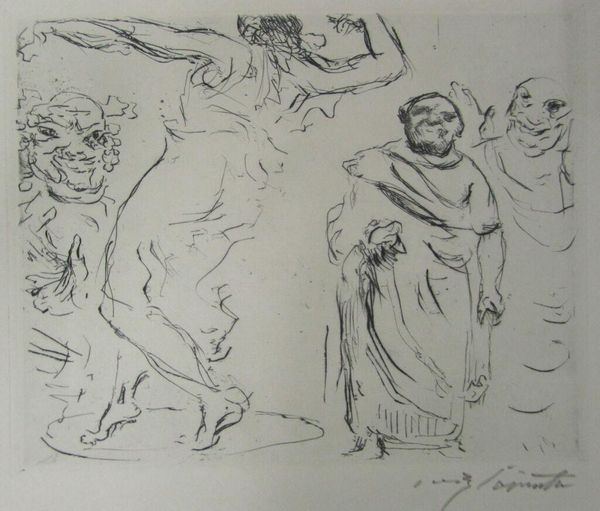Editor: Here we have Lovis Corinth's "Trimalchio’s Funeral," a chaotic scene rendered in etching. It feels like a sardonic commentary. What’s your take on this piece? Curator: Considering Corinth’s era, this print can be viewed through the lens of social critique, questioning societal norms around death and mourning. Are we celebrating or mocking Trimalchio? The lack of clear lines blurs this distinction. Editor: So, the ambiguity itself becomes part of the statement? Curator: Exactly. It prompts us to question who benefits from spectacles of mourning and whose voices are silenced in these displays. Editor: I see it now; the print isn’t just a historical scene, but a challenge to power structures. Curator: Precisely! It seems Corinth intended for this piece to be provocative.
