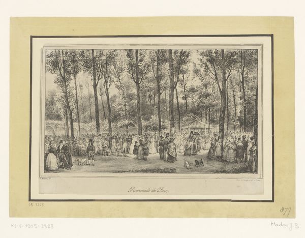 Curator: Léopold Flameng's print, made with ink on paper, captures a serene yet poignant moment: "Four Veterans Walking in a Park with Children Playing", dating back to 1859. Editor: My initial reaction is of wistful melancholy, actually. The grayscale palette casts a somber mood, contrasting with the lively scene of children at play. Curator: Indeed, the juxtaposition is striking. These veterans, likely scarred by war—we see at least one using a walking stick—are observing children embodying innocence and vitality. The park setting becomes a stage where the past and future converge. It suggests the passage of time and perhaps generational trauma. Editor: Absolutely. I find myself reflecting on the historical context: 1859 was a time of immense social and political change in Europe. The lingering echoes of past conflicts were ever present. These veterans likely bore witness to those struggles, their presence serving as a stark reminder to the playful youth of the realities of life. It speaks volumes about who gets to experience leisure and carefree joy, versus who has been sacrificed. Curator: Notice Flameng's skill in engraving; the detail, despite the print’s small scale, is remarkable. Each line meticulously rendered contributes to a powerful narrative, filled with allegorical weight. It feels significant to remember these individuals carried memories of empire and shifting nations into a new era. Editor: And the fact that they're together suggests a camaraderie forged in shared experience. It could also be seen as a critique of how society treats its veterans—marginalized, relegated to the sidelines while life goes on around them. Are their sacrifices truly remembered, or are they simply tolerated? The artist cleverly draws a commentary about nationhood through social issues. Curator: It's a poignant representation of resilience, but it's also a cultural study—capturing fashion, social strata, and historical context, which can be analyzed through symbols to give meaning to their emotional weight in the passage of time. Editor: Ultimately, the artwork sparks an uncomfortable dialogue about power, privilege, and the enduring consequences of conflict. Curator: Thank you, together we were able to discover that symbols of perseverance exist even within works displaying delicate serenity. Editor: It’s a visual record of memory that reminds us about what progress is meant to look like.