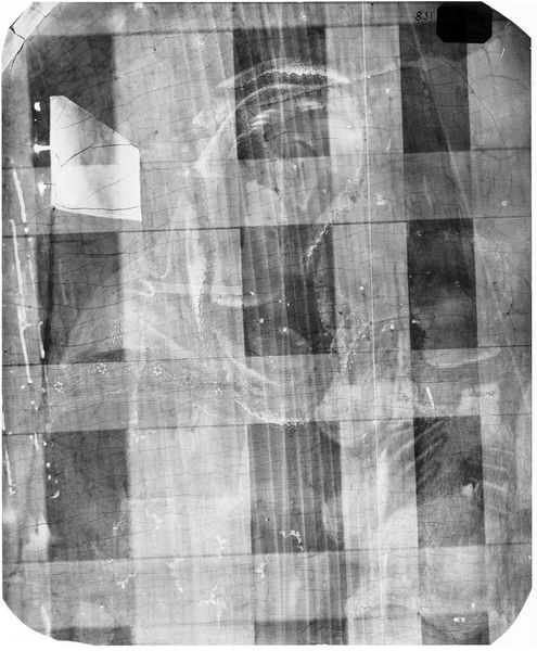 Curator: This is an X-radiograph of "Waiting Room," originally by Honoré-Victorin Daumier, currently residing in the Harvard Art Museums. Editor: My first impression is one of ghostly ambiguity, a veiled representation hinting at something obscured. Curator: The X-ray reveals the layered construction beneath the visible surface, the materiality of the canvas and paint. Note how the density varies, suggesting reworkings. Editor: Exactly. It's about the process of creation, the labor and the revision, not just the finished image. What's been taken out and what’s been built up? Curator: It's fascinating how the medium itself, the X-ray, transforms the artwork into an object of scientific scrutiny. Editor: It’s almost a deconstruction, bringing hidden effort into view and challenging the notion of the art object as something precious or untouchable. Curator: Indeed, this image shifts our focus from aesthetic appreciation to the very material conditions of its making. Editor: A ghost of a painting, revealing its past in its present.