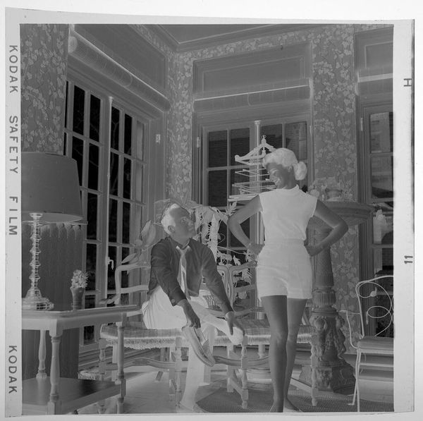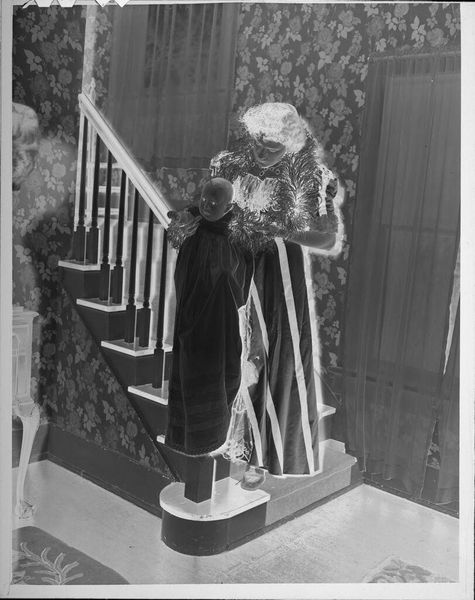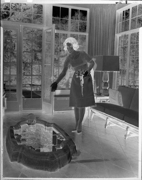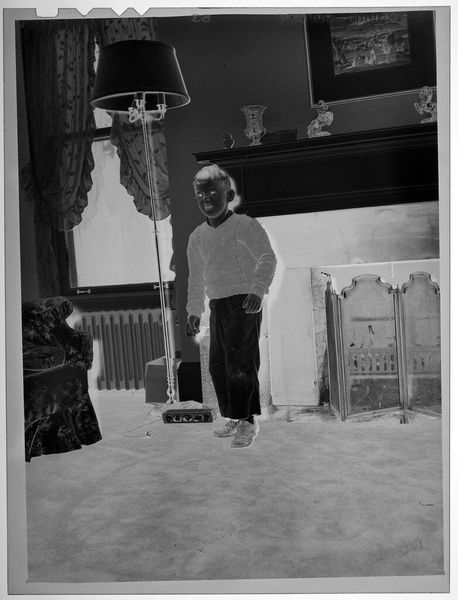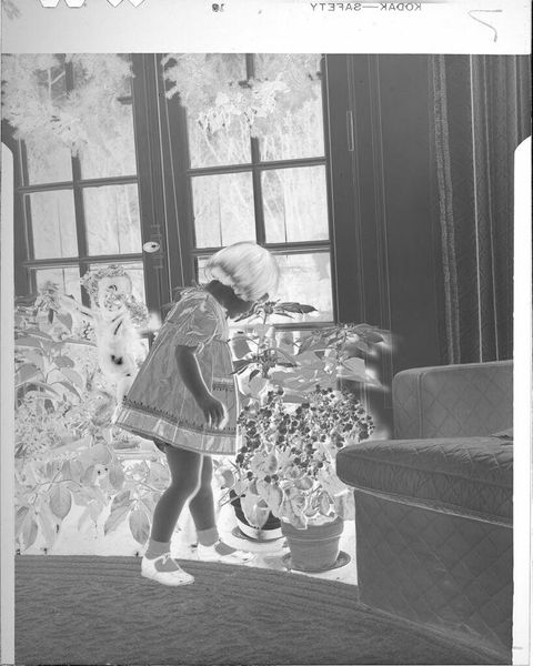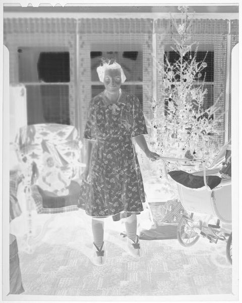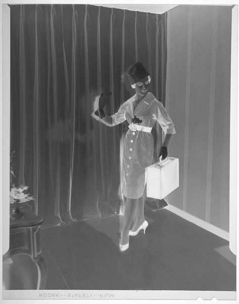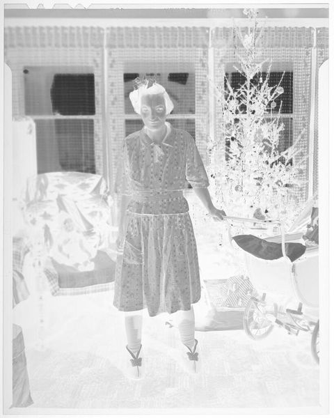 Editor: We are looking at an untitled photograph by Martin Schweig of a young woman posing with a bouquet. It has an ethereal, almost ghostly quality. What do you see in this piece, beyond the surface? Curator: Oh, the quiet confidence! I'm drawn to the way the light almost sculpts her form against the backdrop of those windows. There’s a story here, a rite of passage. The bouquet isn't just flowers; it's a symbol of blossoming womanhood. I wonder, what was going through her mind at that very moment? Editor: It's interesting how a simple portrait can hold so much unspoken narrative. I hadn't considered the bouquet as symbolic. Curator: Absolutely! It's like a secret language, isn’t it? This image reminds me that art is a window into the soul.