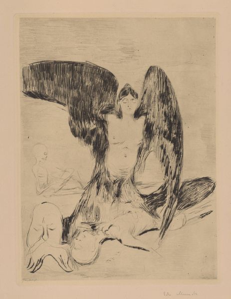 Editor: This is Lovis Corinth’s lithograph, "Letter K: Kiss!" From what I gather, it has no definite date. It evokes a rather intense embrace. What can you tell me about this print? Curator: The lithographic process itself is crucial here. Consider the transfer of image from stone to paper—the labor involved. How does this relatively accessible medium democratize themes of intimacy and sexuality, previously confined to elite art forms? Editor: That’s fascinating! So, it's not just about the "kiss" itself, but the means by which it's represented and consumed? Curator: Precisely! The mass production allows for a broader social dialogue, challenging the boundaries of artistic expression and its engagement with the public.