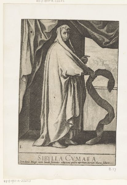 Editor: So, here we have Raffaello Schiaminossi’s engraving, "Profeet Daniël," made somewhere between 1606 and 1609. The detail is striking, especially in the robe and the landscape behind him. I find it very serious and contemplative, especially the Prophet’s intense gaze. What stands out to you when you look at this piece? Curator: Immediately, I consider the Counter-Reformation context. Prints like these served a crucial public function. Images of prophets reinforced religious doctrine during a period of intense religious and political strife. Notice how Daniel is depicted – strong, scholarly, undeniably righteous. It's not just about the biblical story, it’s about reaffirming religious authority. Editor: So, you’re saying the artist is making a statement through Daniel's character? Curator: Precisely. How does the public perceive religious figures? How are these perceptions shaped by institutions? The Rijksmuseum is a predominantly Protestant space. In that sense, this piece now serves to open dialogue and allows its visitors to consider their perceptions of faith, regardless of the artist’s intentions when it was originally made. Do you think the composition itself contributes to this message? Editor: Well, the way he's positioned slightly above the viewer makes him appear dominant, but the relatively small size of the print makes that statement feel less imposing. It's interesting how the scale impacts the overall message. Curator: Exactly! These nuances highlight the complex interplay of social forces, artistic intention, and public reception. Considering this piece, how might our understanding of early modern religious art shift? Editor: I guess, seeing how an artwork originally made to reinforce dogma can become a tool to understand historical contexts is very interesting. Thanks, that makes me rethink how I see similar works now. Curator: Absolutely! It highlights how museums contribute to these shifting interpretations, shaping the way the public engages with art and history.