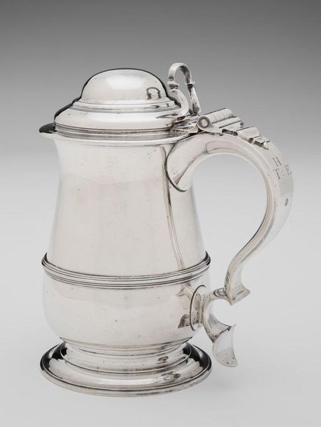 Curator: Just look at the luster on this tankard! It practically glows. Editor: It does possess an undeniable gravity. There’s a formal air about it, wouldn't you agree? The sheer, unadorned silver speaks volumes. Curator: This piece, titled "Tankard," was crafted between 1720 and 1745 by Simeon Soumaine. It’s a sterling example of Baroque silverwork. The Art Institute of Chicago is fortunate to have it. Editor: That Baroque exuberance shines through despite its functional nature, it’s designed to hold something quite prosaic like…beer? Yet it elevates the act of drinking, wouldn’t you say? Curator: Certainly. The very medium, gleaming silver, speaks of wealth and status, and of course, the exquisite chasing suggests an intention to impress. The engraving features an interesting combination of foliate ornamentation and heraldic imagery. What cultural memory do you read in it? Editor: The stylized lion rampant likely references the family lineage and valor, while surrounding scrollwork reinforces aspirations for wealth and security. The choice of silver is hardly accidental; beyond mere decoration, silver suggested permanence and posterity. Curator: This form of material display allowed for cultural gatekeeping, didn't it? Serving, quite literally, as a vessel for cultural meaning? Who was permitted to drink from it and under what circumstances, communicates a host of information, wouldn't you say? Editor: Absolutely. The act of offering a drink becomes charged, a social and political theater. Consider the implications of denying a draught from this gleaming vessel... Curator: I can imagine! Well, this "Tankard" by Simeon Soumaine does more than quench thirst; it speaks of power, lineage, and societal dynamics. Editor: It reminds us that even everyday objects carry potent stories if we take the time to listen, or in this case, to look!
