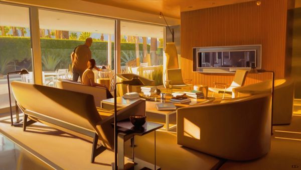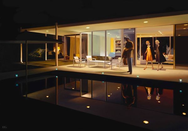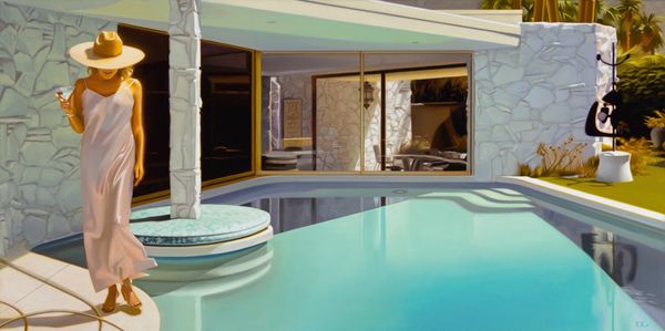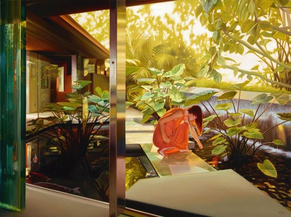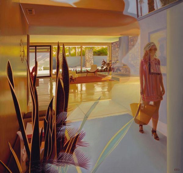 Carrie Graber paints “Garden Overlook,” an undated oil on canvas, inviting us into a space where interior meets exterior. The woman, poised at the window, becomes a focal point for contemplation on identity and the gaze. Her positioning, with her back turned, allows us to project our own narratives onto her, while she looks to the garden for inspiration, reflection, or perhaps escape. Graber explores the tension between the private sphere of the home and the natural world outside, questioning the traditional roles assigned to women within domestic spaces. The artist plays with the concept of the idyllic, but also with the emotional space of the interior, making us wonder about the woman’s connection to the space. Does she feel confined? Does she feel free? In ‘Garden Overlook’, Graber evokes a quiet power, reflecting on the complexities of womanhood.