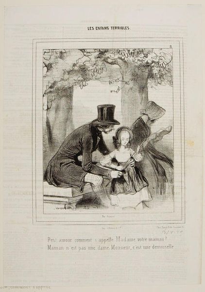 Editor: This is a lithograph by Paul Gavarni titled "Mom wrote to Mr. Prosper and papa saw the letter . . .". The scene seems quite tense. What emotional undercurrents do you see in this image? Curator: The letter is a potent symbol. Consider its weight as a physical object, now charged with suspicion and perhaps betrayal. The father figure clutches it, almost defensively, as if holding onto a fragile truth. Notice the child’s averted gaze – what does that suggest to you? Editor: Perhaps guilt, or discomfort? It makes me wonder about the cultural expectations around family and secrets during that era. Curator: Exactly. Gavarni captures a moment laden with unspoken anxieties, a cultural snapshot where domestic life is anything but simple. The letter becomes a stand-in for hidden desires and social transgressions. It’s a tiny drama, writ large in symbolic form. Editor: I never thought a simple letter could contain so much meaning. Curator: Visual symbols often do, don't they?