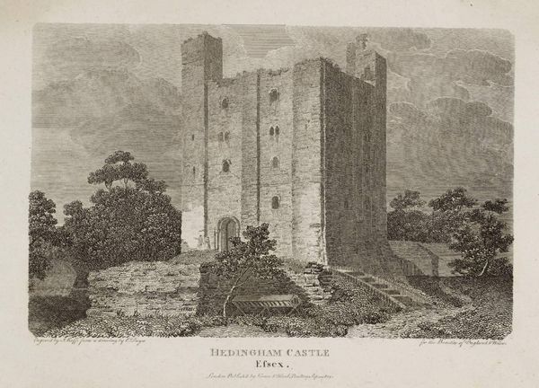 Curator: This is Brougham Castle, Westmoreland, an engraving by J. Noble after a drawing by Edward Dayes. Editor: Whoa, it looks like a moody postcard from a forgotten kingdom. I immediately feel a sense of melancholy. Curator: Yes, the ruined castle often represents the transience of power, the inevitable decay of even the grandest structures. The crumbling stone is a stark symbol of time's passage. Editor: I can almost hear the whispers of history echoing from those broken walls. The light and shadow make it feel like a stage set, with the drama of centuries playing out. Curator: Notice how the clouds mirror the castle's jagged silhouette. This mirroring effect emphasizes the connection between human creation and the natural world, both subject to weathering. Editor: It does feel like a dream, or maybe a warning. I'm left pondering what legacies we leave behind and what will remain. Curator: Indeed. A poignant reflection on the nature of legacy.