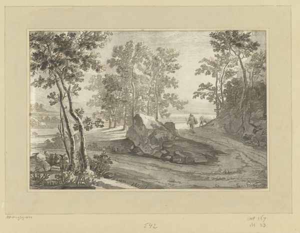 Editor: This engraving, "River Landscape with Ruins, Shepherds, and Goats" by J.L.L.C. Zentner, created between 1791 and 1798, feels strangely serene, almost melancholic. All these goats seem so unaware of the ruins and their meaning, if any. How do you interpret this work? Curator: This piece provides a lens into the complex power dynamics of the late 18th century. We have shepherds, seemingly passive figures, within a landscape dotted with the crumbling remnants of a former power structure. These aren’t just picturesque ruins. They signify a shift, a historical break. But who is benefiting from this shift, and who is being further marginalized? Where are women in the narrative? Editor: That’s interesting, I hadn't considered that at all! So the landscape becomes a stage for understanding social change? Curator: Precisely! Consider how the goats, likely sources of labor or sustenance, are foregrounded while the human figures are smaller, almost secondary. Does this suggest a questioning of the traditional hierarchy, a highlighting of the contributions of the working class while keeping a European gaze? Also note how these classical ruins signal an appropriation of antiquity in European academic art, reinforcing an implicit sense of cultural authority over other narratives. Who gets to decide what constitutes progress or civilization? Editor: So the seemingly simple pastoral scene is actually prompting a discussion about power, labor, and historical narratives? Curator: Exactly. Art provides us with a space to question established structures and create dialogues on these critical questions through social discourse. How else can we bring marginalised perspectives and identities into dialogue with accepted social hierarchies and art practices? Editor: I hadn't considered all those layers! It definitely changes how I see it, knowing what it might represent culturally. Curator: Indeed. Art constantly beckons us to confront, examine, and, hopefully, reshape the narratives surrounding us.