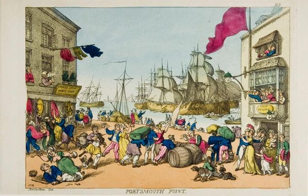 Curator: This chaotic scene before us is George Cruikshank's etching with engraving, titled "The Piccadilly Nuisance!", created around 1818. Editor: Chaos indeed! It looks like market day gone completely wrong, a swirling vortex of bodies, goods, and potential disaster. Curator: It really captures the bustling, often overwhelming, experience of London's commercial center. The composition funnels our gaze into the throng, highlighting the intense competition for space and resources. I see so many types of food being sold. This feels so visceral, like I am shoulder to shoulder with these characters. Editor: For me, that overflowing abundance immediately says something about English society at the time – the emerging middle class and the aspirations for consumer goods, perhaps even commenting on anxieties about controlling the unruliness. Curator: Note how Cruikshank, using etching and engraving on paper, renders the intricate detail of each individual. Consider the labor invested in producing prints like this for mass distribution; these images weren't simply artistic expressions; they were commodities in themselves. Editor: But the symbolism! Look closely at the figures—each character seems to embody a specific social type. The overloaded wagon, the panicked expressions; it all speaks to a society teetering on the edge of collapse, or at least, facing immense societal pressure. Isn't that Flanagan's sign in the upper-right there? What sort of trade happens near that particular landmark? Curator: It does reflect the anxieties of the time regarding economic disparity. And remember that prints like these also served a political function. Cruikshank frequently satirized political figures and social issues, holding a mirror up to the establishment, and this piece could be construed the same. Editor: So while you're seeing the mechanics of production and the impact of commerce, I am reading the visual cues of social commentary, recognizing symbols of both stability and anxiety within the bustling urban landscape. Fascinating to see how a single image can contain so many different yet interwoven layers of information. Curator: It certainly underscores the value of approaching artworks with a broad understanding, one that incorporates both material context and symbolic readings to have an understanding that resonates through the centuries.