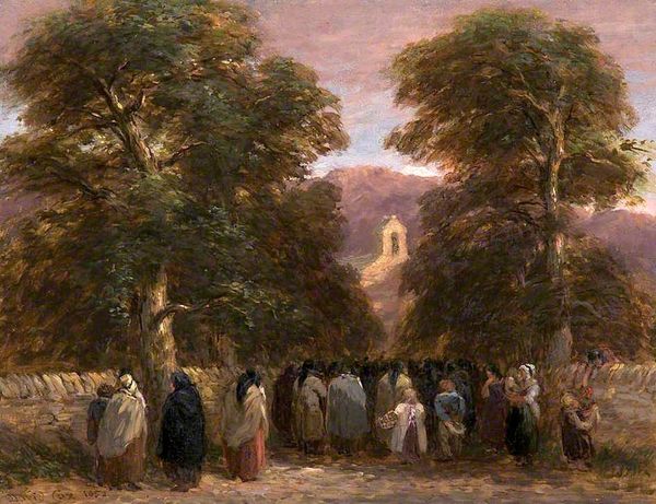 Editor: We're looking at "The Emigrants' Departure," an oil painting by Frederick Morgan. There’s a large group of figures waving farewell to a wagon disappearing on the horizon. It’s striking how the warm tones almost seem to amplify the melancholy mood. What do you see in this piece? Curator: This work, seemingly simple, reveals much about 19th-century material realities and the social forces driving migration. Note the artist's choice of oil paint; its accessibility compared to fresco speaks to a shifting art market, aiming for broader consumption. Consider also, who is leaving, and why? Land enclosure, industrial revolution – these forces pushed people off the land, making emigration a *manufactured* necessity, rather than a simple choice. Editor: So you’re saying the artist's choice of materials, and the very subject of emigration, points towards larger economic shifts? Curator: Precisely. Romanticism often gets painted as idealized nostalgia. But this, perhaps unconsciously, exposes the *cost* of progress. Where did the materials for the painting itself come from? Whose labor produced them? It all points to a complex web of extraction, production, and ultimately, consumption of both art and experience. And look at the landscape. Editor: It's vast, but almost barren, reflecting that hard way of living perhaps? Curator: Indeed. It makes me wonder how Morgan intended the viewers – likely wealthier patrons – to *consume* this image. Was it to provoke empathy, or simply aesthetic enjoyment of a carefully manufactured scene depicting economic pressures in this time period? Editor: That makes me think differently about what’s going on beyond just the surface of the painting. Curator: Exactly! By understanding how social and material circumstances shaped both the subject and creation of the work, we gain deeper insight into 19th-century society and artistic production itself.