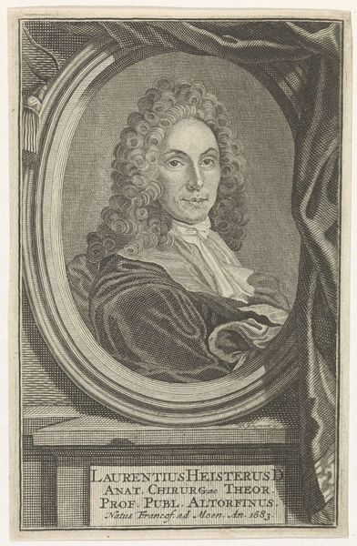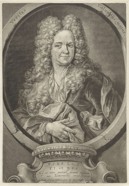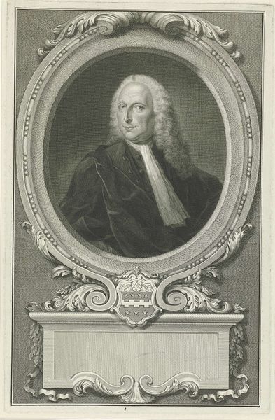 Editor: This engraving is a portrait of Jean Barbeyrac by Jacob Houbraken, created sometime between 1717 and 1744. It’s got this wonderfully ornate Baroque feel, but there's something almost severe about the man’s gaze. What do you see in this piece, especially concerning how the symbols are used? Curator: Ah, yes, an excellent observation. Look closer at the intricate details. This isn't merely a portrait; it's a carefully constructed presentation of identity. What catches my eye immediately is the interplay between text, image and symbol. It represents Barbeyrac's persona and enduring influence. Editor: The name and the little crest down below? Curator: Precisely! The crest— what does it tell us about Barbeyrac's lineage, his affiliations, or his status? This visual vocabulary roots him within a specific social fabric. But also, consider the gaze, like you said. In his stare, is there confidence? Defiance? Something else? Think about what those elements evoke within you. Editor: Hmm, I see that. It makes me think about power, but it’s like, power that's both acknowledged and maybe a little bit questioned? Also, there's the wig; it’s such a central image of the time. Curator: Indeed. Wigs weren't just fashion; they signified legal standing, scholarly pursuits, or positions of authority. That luxuriant wig screams importance. The visual language of Baroque portraiture is never accidental. What do you think that communicates about cultural memory? Editor: It’s like he's actively building a legacy, deciding how he'll be remembered. I hadn't thought about how consciously they used these symbols to shape their image! Curator: Precisely! Houbraken captured more than just a likeness. The layers of symbolism create a lasting representation of status, identity, and aspiration. This image speaks to the cultural importance of legacy. Editor: This has really opened my eyes to looking beyond the surface!
