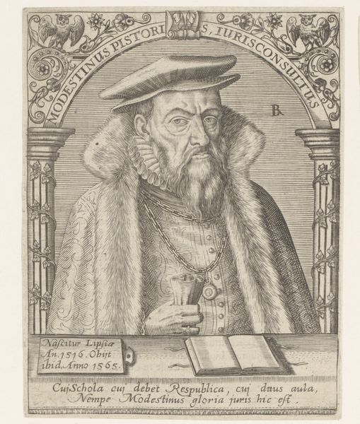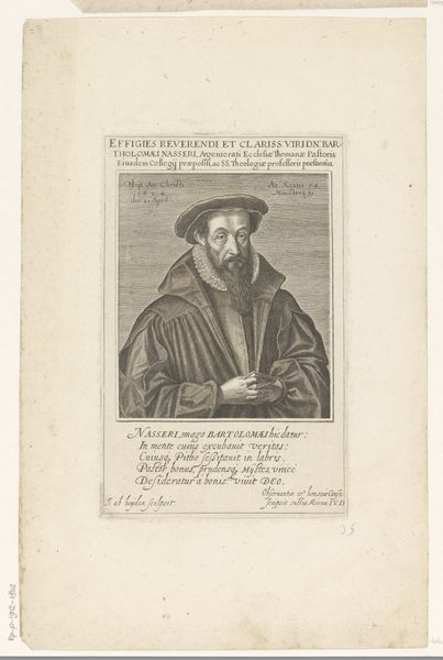 This is an engraving of David (II) Pareus by Jacques Granthomme, made in the 17th century. Immediately, the intricate linework and contrasting shades evoke a sense of solemnity, a stillness that invites close inspection. Granthomme has structured the composition around the figure's steady gaze and the book held in his hands. The precise details of Pareus's garments and the texture of his beard create a sense of depth, but also an intellectual intensity. We can appreciate how the formal elements contribute to the overall symbolic weight, especially when seen through the lens of semiotics. The text surrounding the portrait and the inscribed book serve as signs that work together to communicate meaning. The way Granthomme uses the interplay between the visual and the textual disrupts any fixed interpretation of the subject. The portrait becomes a site of ongoing dialogue between image, text, and viewer.