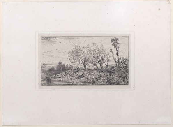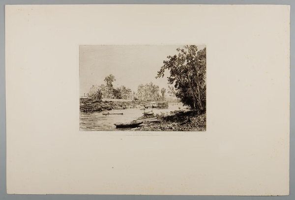 Axel Holm created this small etching, Gadekæret i Brønshøj, with ink on paper. The composition, organized horizontally, is dominated by the interplay of light and shadow, creating a sense of depth and volume. Look closely at the lines: they vary in thickness and direction, and define the edges of objects while also modelling their surfaces with tonal gradations. The reflections in the water introduce an element of inversion, blurring the boundary between the real and the reflected. Consider how Holm uses line and form to engage with broader artistic concerns. The etching technique allows for detailed representations of texture and light, a language employed in the late 19th century to capture fleeting moments of everyday life. This allows us to think about the nature of representation itself. The balance between precision and suggestion invites us to consider how the artist’s technique functions not just aesthetically but also as a reflection of the cultural and philosophical contexts in which it was produced.