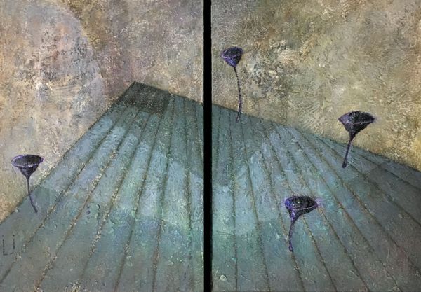Lech Jankowski made this diptych painting called Niebioskości with paint that looks like it was laid on thick, like frosting. I am drawn to the surfaces of these panels: their textures, colors, and that gritty surface, worked and reworked, full of chance encounters. The paint is opaque, it covers everything, even the light. There are embedded horizontal bars like windows or blinds. It's easy to see how the piece was made, stroke by stroke, with the kind of directness I love. Each gesture is visible, and it all adds up to this unified whole. The artist is maybe pointing to the idea that a painting can be an ongoing conversation, a place for experimentation, somewhere things can stay open and unresolved. I look at these two panels and I wonder, what is the real horizon?