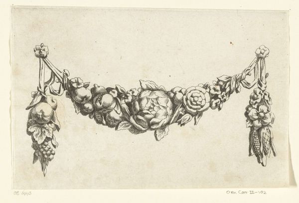 This is a design for a festoon, made by Francoys Dancx sometime before his death in 1703. It’s an etching, meaning that the artist would have painstakingly drawn the design on a wax-coated metal plate, then bathed it in acid, which bites into the exposed lines. The resulting image has a crisp, precise character, which here serves the purpose of illustrating an elaborate swag of fruit and flowers. Note that the artist has given careful attention to the textures of each element: the waxy skins of the apples, the complex structures of the pinecones, the velvety petals of the roses. Prints like this weren’t meant as artworks in themselves, but as models for other makers to follow, in executing carvings, plasterwork, and other forms of ornament. This was a period when design was understood as a process of dissemination and skilled interpretation, rather than individual genius. So, this seemingly modest print offers a fascinating glimpse into the division of labor in the early modern period.
