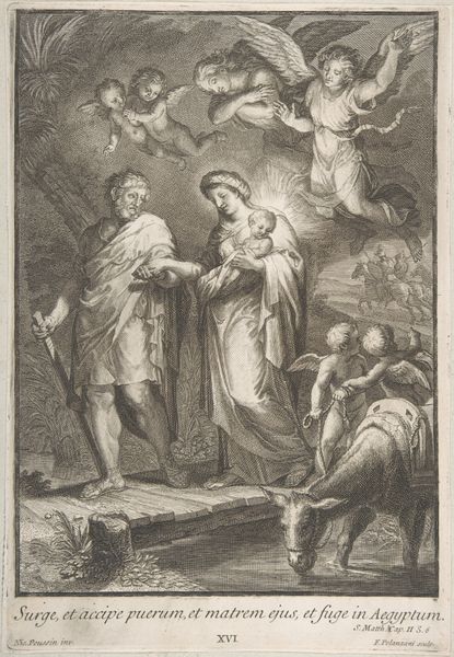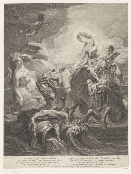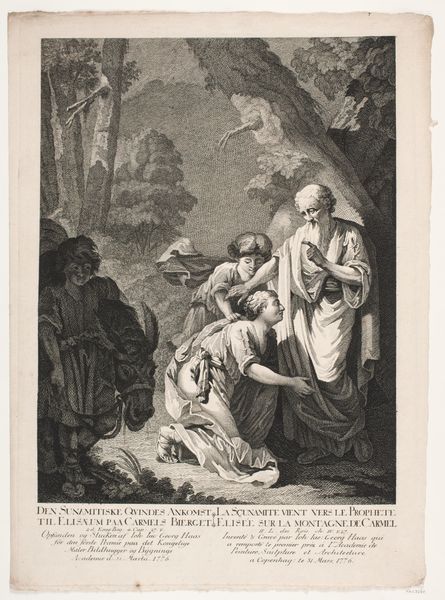 Editor: Salvator Rosa's print, "Saul Consults Samuel After the Witch of Endor Has Conjured", depicts a rather eerie scene. I'm immediately struck by the swirling chaos of the spirits summoned, juxtaposed with the relative stillness of Saul and Samuel. How do you interpret the stark contrast in this piece? Curator: Well, first, doesn't this make you feel as though we’re peeking into a nightmare? I always get the shivers looking at this! The way Rosa captures the biblical story… you almost feel the forbidden thrill Saul must have felt, desperation overriding his good sense. Look how he renders the figures - Saul so rigid in his desperation, Samuel an apparition swathed in cloth; versus the active pose of the witch as she's evoking the magic from Samuel. But tell me, what does this all make you *feel*? What ghosts does it conjure from *your* history? Editor: Ghosts from my history... I suppose the idea of seeking answers in forbidden places resonates. It feels timeless. Curator: Exactly! The print breathes a life that transcends the subject. It captures a universal human desire – to know what the future holds, even when we suspect the knowledge might destroy us. Consider the composition: everything leads your eye towards the central, spectral figures. Rosa is practically conducting a sinister symphony for our senses. Does this add a fresh insight, change anything for you? Editor: Absolutely! I was so focused on the literal narrative that I missed the emotional current flowing through it. Thank you for highlighting that. Curator: It’s art’s greatest trick, isn’t it? Disguising profound feeling as mere story. It makes me see everything a little differently now, too. Thanks for pointing me in that direction.