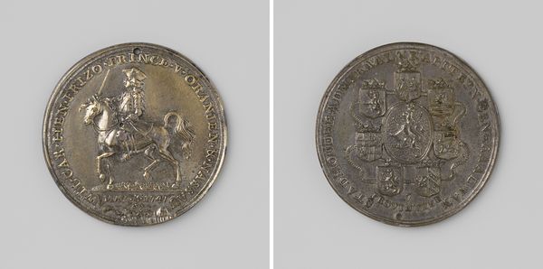 Editor: So, here we have a piece from 1578 titled "Johan Casimir, hertog van Palts-Simmern, regent van de Palts" by an anonymous artist, currently housed in the Rijksmuseum. It's a metal engraving, a portrait really… something about the detail on such a small surface is quite striking. How would you interpret this work? Curator: Think about coinage in its time. More than mere currency, each coin was a miniature monument. Johan Casimir's portrait isn't just an image; it's an emblem, consciously designed. Note the Mannerist style: elongated forms, intricate detail, surface elaboration. These choices project power and refinement. What does that iconography communicate to the populace about their ruler? Editor: It definitely feels like an assertion of authority. All the fine details in his clothing, the crisp lettering… almost like a carefully constructed brand image. Curator: Precisely! His gaze, his garments, the symbolic weight of the Palatinate coat-of-arms on the reverse – it's all orchestrated to inspire a particular sentiment, probably obedience but possibly awe or perhaps confidence during an uncertain time. Consider that even the choice of metal – likely silver – adds another layer of meaning. A sense of stability and preciousness, maybe? Editor: So, even something seemingly utilitarian like a coin is loaded with carefully chosen imagery meant to convey very specific ideas. The choice of the imagery reflects power. It makes you wonder about all the symbolic choices in art we often overlook. Curator: Indeed! Recognizing these visual cues lets us understand not only the intentions of the artist or patron, but also the complex network of meanings circulating within a culture at a specific point in time. Even an everyday object like this becomes a window into the past.