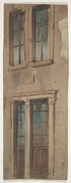 Isaac Gosschalk created this watercolour and pen drawing entitled ‘Seventiende-eeuwse gevel’ showing a seventeenth-century facade. The building, rendered in muted reds, blues and browns, is defined by rectangular shapes and vertical lines, projecting a sense of formal order. Notice the emphasis on architectural detail. The intricate windows and ornate decorations suggest a focus on surface and structure. This attention to detail invites us to consider the interplay between representation and the thing represented. How does Gosschalk use form to create meaning, and how does this relate to our understanding of architectural space? Consider how the drawing reflects a broader cultural interest in the past, and the ways in which artists like Gosschalk engage with and re-interpret historical forms through their work. The drawing captures the essence of the building's historical period while also infusing it with a unique artistic vision. It's a structure of art, of signs, which engages our understanding of architectural space and its cultural significance.