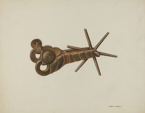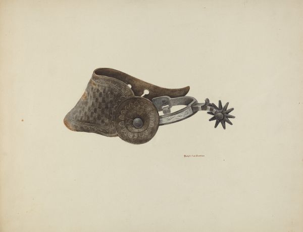 Curator: Before us we have "Spur," a watercolor and graphite drawing, dating to around 1936, by Harry Mann Waddell. Editor: The first impression is one of stark functionality, somehow stripped of context and floating in isolation. It feels almost surgical, precise, yet hinting at something more forceful, like pent-up aggression. Curator: Well, its starkness reflects the broader social climate of its time. This work emerged from the Index of American Design, a New Deal project created to document American decorative arts and folk art during the Great Depression. The project emphasized accurate visual records, which helps explain its almost scientific quality. Editor: So, a conscious effort to remove subjectivity then? The visual weight of that spiked wheel... It suggests pain, control. The imagery of the spur has always evoked power, hasn't it? Consider the language we use even today-- spurred into action. Curator: Indeed, and the project hoped to preserve a national identity and common heritage amidst economic turmoil. Waddell, alongside other artists, captured everyday objects like this to remind people of ingenuity and craft rooted in local culture. This wasn't simply about documentation, it was about celebrating American innovation when global capitalism faltered. Editor: So it functions as a tool, of both power and national consolidation, represented plainly on the page. Still, in this composition, the negative space feels deliberate. Does the bare backdrop amplify a sense of displacement in this object? Curator: It could, though perhaps it emphasizes its singular nature. By presenting the spur without any trappings, context, or setting, its form alone gains prominence. Each part can be appreciated independently, maybe prompting thoughts about labor, local crafts and traditions, all relevant to Waddell’s initial context. Editor: I agree that is plausible. But let’s admit the form alone holds something compelling. Seeing this symbol, meticulously drawn in watercolor, I'm reminded that symbols can be tools too; shaping identity, reinforcing history, or subtly provoking viewers towards less comfortable meanings as well. Curator: Perhaps, in revisiting Waddell’s work, we too are “spurred” to new insights about a fraught time. Editor: Precisely. Art's power endures in asking those questions.