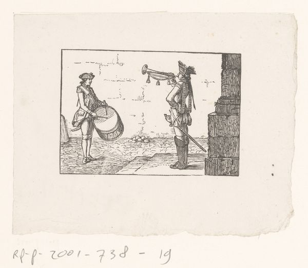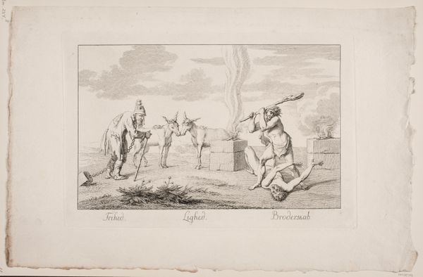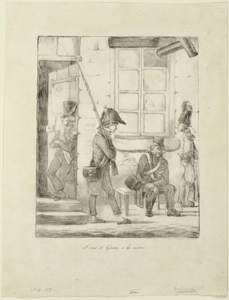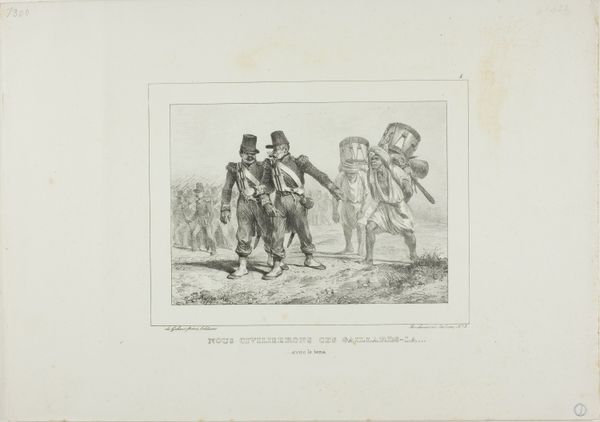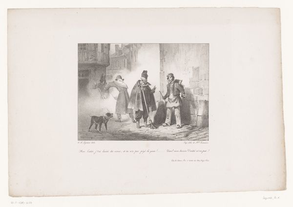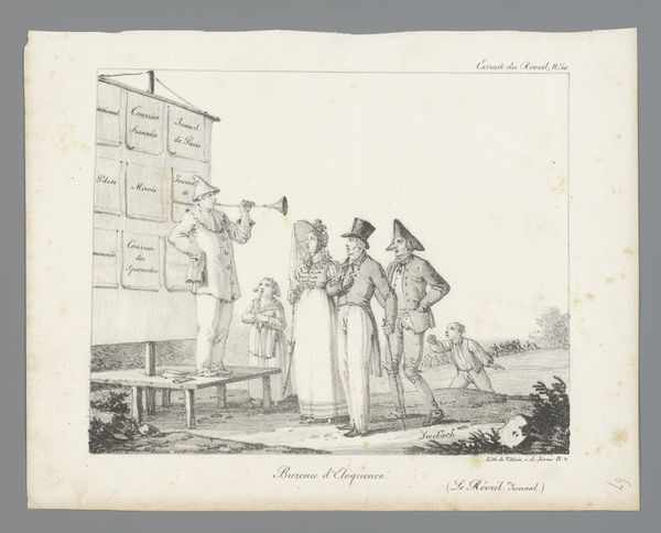 Curator: This is “Væddeløbet ved København, en folkefest,” or “The Race at Copenhagen, a Public Festival,” crafted between 1832 and 1833 by N.B. Krossing. The artwork before us combines drawing, etching, and lithography. Editor: Well, straight off, I’m getting a ‘quiet riot’ vibe, you know? There’s this almost comical tension bubbling under the surface, despite the muted tones and stillness. Makes me wonder what kind of party this really is. Curator: Indeed. Krossing employs a masterful use of line and composition here. Note the sharp, almost angular figures juxtaposed against the softer background. This contrast enhances the sense of immediacy, drawing our eyes to the central characters and their dynamic interaction with the implied architectural structures. Semiotically, we can decode the clothing, gestures, and relationships between figures, analyzing how they symbolize social class, hierarchy, and power dynamics inherent in early 19th-century Danish society. Editor: Right, the rigid posture of the fella in the top hat practically screams 'authority,' doesn't it? Then you’ve got these other characters kind of huddled near a makeshift wall—feels like they’re scheming, betting, or just trying to get out of view. There’s a sense of playful deviousness. It is all, literally, etched in a very particular moment in Copenhagen. A stolen moment. Curator: Exactly. Krossing presents the racing event in Copenhagen, but goes further in that the focus becomes the onlookers and a depiction of their societal reality. The strategic placement of figures directs the viewer's gaze, compelling us to speculate about their hidden motivations and the complex interplay of desires within this social landscape. Editor: I can almost hear the hushed whispers and the muffled laughter; can you imagine, it being such a different world! Thanks to the composition, those guys at the makeshift walls are what grabs your interest. Curator: The beauty lies in its capacity to generate new interpretations each time. I notice I am especially moved today by its textural complexities. Editor: Right! It definitely scratches an itch, and then tickles. I wonder where they are all now...