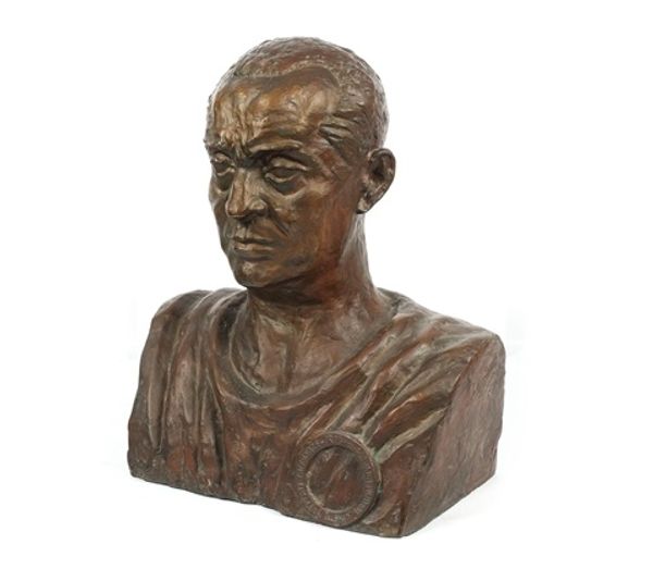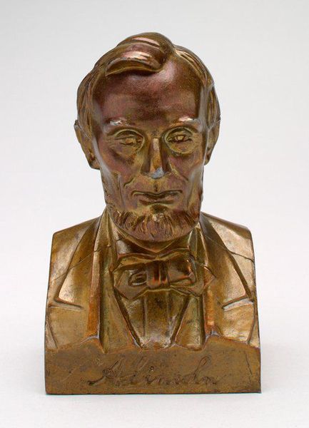 This little Roosevelt bust, probably made of cast metal around the mid-20th century, has a kind of earnestness about it. The maker, Kenton Hardware, wasn’t trying to trick you with virtuoso detail, but you sense they put their back into it. There’s a directness in the approach that’s appealing. The surface is a kind of bronzy color, but it's mottled, like an old penny that’s been kicking around a while. The texture isn’t smooth; you can see the marks and pits, like the traces of its making are still visible. It reminds me of those busts and statues you see in old libraries – a bit worn but still full of presence. Look at the way the light catches the ridge of the brow and the set of his jaw. Those little details tell a story. It's like seeing the past through a slightly blurry lens. It brings Marsden Hartley to mind, with that same feeling of homespun and no-nonsense American modernism. Ultimately, it's more about the touch and feel than historical accuracy.