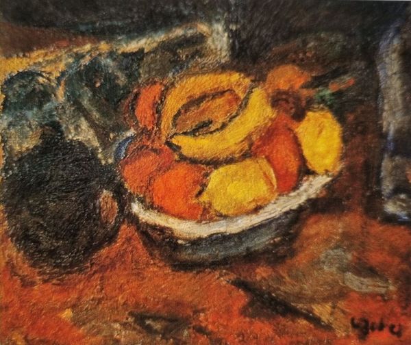 Curator: Welcome. We’re standing before “Czóbel Béla Kancsó,” an oil painting with an impasto technique attributed to Béla Czóbel. Editor: It feels immediately visceral. Earthy tones, oranges and browns predominantly, with bold textures that really bring forward the materiality of the oil paint. It is heavy with feeling. Curator: Indeed. Czóbel’s manipulation of oil paint lends itself to considering his process. Notice the palpable sense of movement suggested by the strokes of the pallet knife—almost chaotic, even though depicting domestic subject matter, ostensibly. What’s your take on the symbolism here? Editor: Well, the 'kancsó', that central pitcher, can often be seen as a vessel. Considering the era, one can read into its cultural significance to be perhaps about domesticity, sustenance or tradition. The vibrant blue splash in the upper corner almost seems to suggest another object...possibly? Curator: Perhaps. And to broaden that scope a little bit, thinking about that domestic subject matter, its creation speaks to the broader access to resources Czóbel experienced. This reflects shifts in artistic patronage at the time, impacting not just who was making art, but what subjects they chose to depict. Editor: True. And within the historical context, a still life like this speaks quietly about the everyday while indirectly alluding to universal, ongoing human experiences. Curator: I agree, considering the artist’s choice of impasto with oil paint. The sheer amount of paint and the labor involved signal something significant. The medium enhances the tactile aspect and adds another layer of meaning. It’s not merely representing a vessel but emphasizing the act and process of depiction. Editor: It certainly draws attention to its status as an object in itself. Ultimately, the piece is complex. It’s grounded, referencing fundamental objects while simultaneously, I think, managing to be uplifting. Curator: A keen assessment, I feel. Reflecting on “Czóbel Béla Kancsó,” the way Czóbel worked with readily available resources prompts a reimagining of material production—which reveals profound dimensions related to access, labor, and intention. Editor: Absolutely. From the vessel's symbolism to the artist's application, there’s definitely an emphasis on historical relevance within something as deceptively "simple" as a still life. Thanks for elaborating.