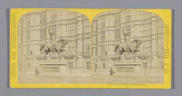 Curator: Look at this intriguing cityscape, “Gezicht op het standbeeld van Godfried van Bouillon…”—or "View of the Statue of Godfrey of Bouillon"—taken between 1861 and 1870. It’s housed here at the Rijksmuseum. What catches your eye first? Editor: It has a sort of melancholic atmosphere. Everything's steeped in this hazy sepia tone. Like peering through a very old dream, of a place just beyond reach. Curator: Indeed, the photographic process of the era certainly contributes to that. We see here a convergence of city planning, photographic technology, and the business of image distribution. The rise of the city necessitates images of its progress, creating this kind of picturesque view of civic pride, captured through the then-novel medium of photography. Editor: Absolutely. And that statue! Godfrey, raised high with his waving flag, presiding over his city. It's an image of power, no question, but look how diminutive the people appear around it! The sculptor’s craft elevates history and then photography reproduces it, both processes shaping public opinion. It’s interesting that the scene also offers a candid representation of folks on the street as passersby—it introduces questions about commerce, access, and who exactly are monuments like these created for? Curator: Good point! Considering that this photograph, meant for distribution, presents not only a constructed ideal but a depiction of daily labor and life occurring around the sculpture. Look closely. This interplay is a testament to photography's dual role: to celebrate but also to document the social and economic context in which monuments exist. Editor: I also like how it manages to capture both the grandness of the city's architecture and these ordinary human details, people almost swallowed by the city itself. This photo reminds us how quickly what is meant to represent permanence morphs, changing how these emblems come to represent values—especially today. Curator: Ultimately, this view connects the material conditions of urban development with our perceptions of history and national identity—as seen through a lens manufactured, distributed, and consumed widely. Editor: A potent snapshot that still resonates so strongly—a melancholy beauty, preserved in sepia tones and sharp lines.