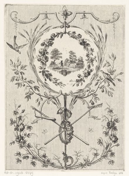 Curator: This engraving, known as "Vlakdecoratie met boer op het land," which translates to "Panel Decoration with Farmer in the Field," dates back to 1750-1770. It’s currently held in the collection of the Rijksmuseum. The artist associated with this print is Georg Leopold Hertel. Editor: It's strikingly balanced! There’s almost a rigorous symmetry that makes it both calming and curiously artificial. Curator: Precisely! What strikes me most is the way Hertel combines rustic, agricultural motifs with the formality of Baroque design. The crossed tools beneath the bucolic vignette speak directly to the labor inherent to this ideal rural existence. Editor: The rose wreath and pastoral image are perfectly offset, but there is an intrinsic dichotomy. Notice the intricate looping framework, its lines both define and constrict, even stifle, the scene. Curator: A valuable observation. I believe Hertel comments here on the artificiality that elite patrons desired. The print functions as a blueprint to legitimize agrarian romanticism, but it could be further viewed through labor; manual creation facilitated in turn the glorification of other, physical efforts within these rural tableaus. The act of its creation adds to the romanticization by representing an economic cycle. Editor: Absolutely, and that very structure implies control and a desire to contain the 'natural' within defined limits. Also the use of engraving is very calculated and effective. Notice how Hertel employs the subtle tonality, which he skillfully achieves using varied linework, creating depth and form within an essentially monochrome medium. It lends the overall design sophistication. Curator: Its form mimics wealth through perceived labor. This piece really highlights how Baroque artists manipulated perception of work and leisure to both critique and idealize contemporary societal values. Editor: For me, revisiting this design clarifies how art and ornament engage to create visual structures of the ideal lifestyle and what materials create an era of idealized production. Curator: A worthwhile design and worthwhile perspective. Thanks!