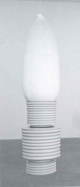 Untitled is one of a series of six untitled, hollow ceramic vessels collectively known as Beachy Head (Tate T12457–T12462). These works are designed to be suspended from the ceiling with stainless steel wire and filled with soap detergent. The ceramic vessel that constitutes the body of Untitled has a glassy off-white surface coating and is shaped like a spinning-top. From the centre of its base runs a transparent silicon hose that is connected to an air compressor that feeds oxygen into the vessel. When the air compressor is switched on, the oxygen mixes with the soap detergent to produce frothy white foam that exudes out of the vessel’s spout. This column of foam, which maintains the cylindrical form of the inside of the vessel, grows steadily upwards until it can no longer support itself. The foam bends and flops flaccidly around the vessel before oozing on to the floor below, leaving a sticky entropic residue. The device continues to produce the foamy precipitate until the emission is entirely dispersed.