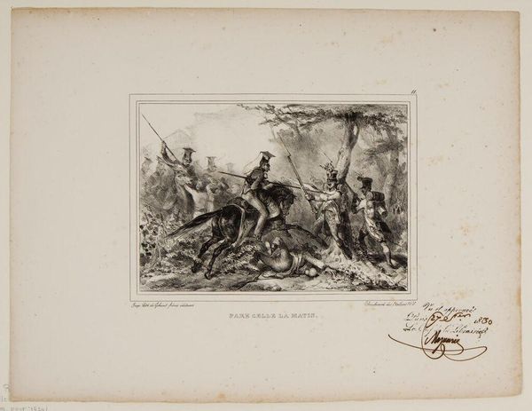 Editor: Raffet's "March of the Crusaders for an Attack" has such a dynamic feel! The use of line really gives a sense of movement. How do you interpret the symbolism at play here? Curator: Consider the weight these crusader figures carry. The cross, a symbol of salvation, becomes a banner of war. Does it suggest religious fervor, or perhaps the manipulation of faith for political gain? Editor: That’s thought-provoking. So the symbols are not just about what they represent, but also how they’re used and perceived? Curator: Precisely! The artist invites us to consider the complex interplay between belief, power, and the human cost of conflict. What does that make you feel? Editor: Definitely something to consider beyond the surface level. Thanks for the insight.
