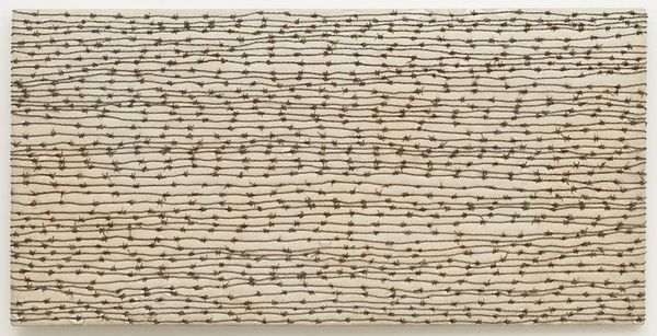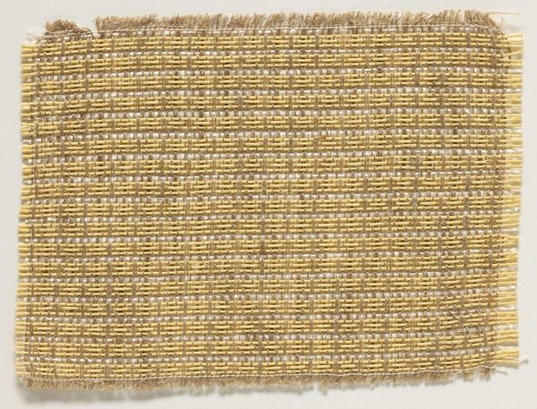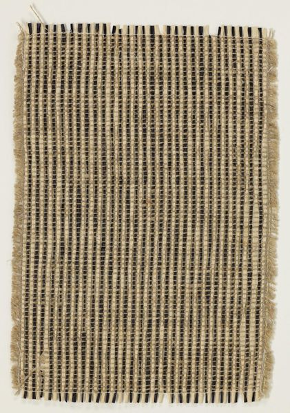 Editor: This is Anni Albers' "Sample of Bronze and White Wall Material." It's a small woven piece, very tactile. It makes me think about domestic spaces and functionality. What’s your interpretation of Albers’ work? Curator: Albers challenges the hierarchy of art and craft. Weaving, historically associated with women's labor, becomes a powerful medium for exploring modernist abstraction. How does its repetitive structure speak to larger social systems of production? Editor: It's like a grid, but softened. Maybe the imperfections represent resistance? Curator: Precisely. Albers is subverting the rigid, male-dominated Bauhaus ideals through a traditionally "feminine" craft. It's a quiet but insistent act of rebellion. Editor: So, it's not just a sample; it's a statement! Curator: Exactly! It encourages us to question what we value and why, and to recognize the political power of marginalized art forms.