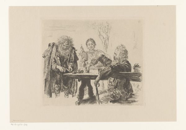 Etienne Carjat created this print, "The Restaurant of the Great Art Exhibition: A symbiotic love for the arts and the cutlet," using graphite, pen and black ink with stumping on cream laid paper. Carjat, a man of the 19th century, straddled many worlds as a journalist, caricaturist, photographer, and writer. In this image, he shows us a snapshot of Parisian society, likely during the annual Salon. The scene hints at the intersection of art, commerce, and social life in a rapidly changing urban environment. It suggests the role of art exhibitions as social gathering places, where one could observe the manners and mores of the bourgeoisie. The woman’s elaborate hairstyle speaks volumes about the era's expectations of feminine presentation. Yet, there is something about the way she sits, slightly turned away, that hints at a certain detachment. Meanwhile, the man, focused intently on his meal, seems oblivious to the artistic surroundings. This contrast invites reflection on gender roles, class, and individual experience within the bustling art world. Ultimately, Carjat's image captures a fleeting moment, inviting us to consider the personal narratives that unfold within the grand theater of art and society.