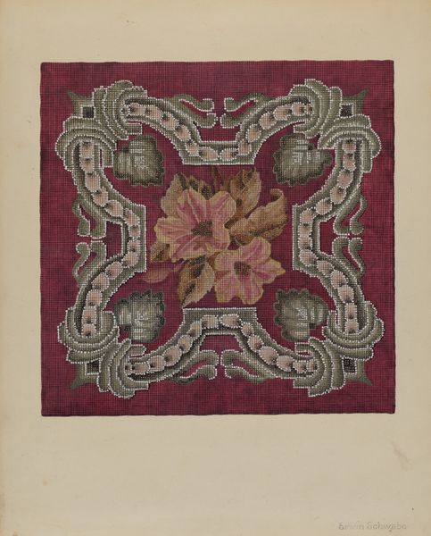 Gilbert Sackerman made this wallpaper design, called Bandbox, using watercolor and graphite. Isn’t it interesting how he approaches mark-making? The floral centerpiece has looser brushstrokes, while the surrounding patterns are much tighter. There's something about the physical presence of the wallpaper's surface that gets me thinking about emotion and design. The paper isn't overwhelmed with texture, but the opaque watercolor gives substance to the forms. I'm drawn to how the eyelet floral basket contrasts against the ornate background. It's like a secret message embedded in the wallpaper. Sackerman’s contemporary was William Morris, whose work features very similar elements, though generally with more vivid colors. Ultimately, art is about seeing the world in different ways, finding new meanings in familiar forms.