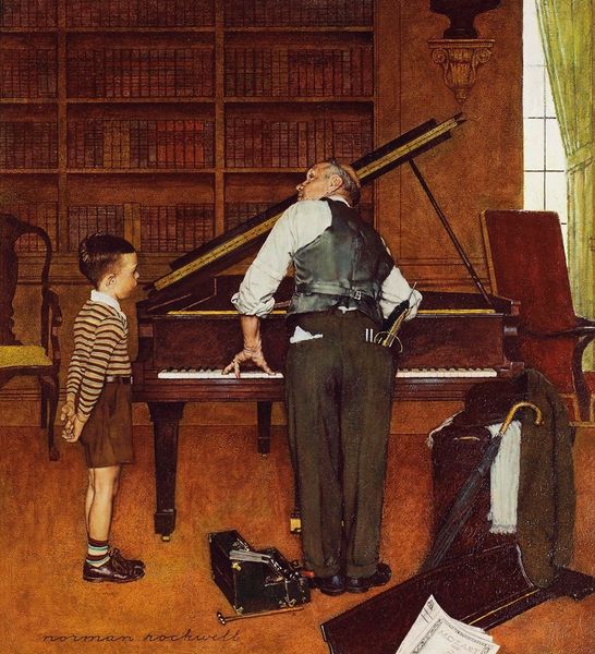 Norman Rockwell painted this evocative scene of a Grandfather and Grandson, capturing a tender moment between generations. The grandfather prepares to light a cigar, a symbol of wisdom and shared stories. The young boy listens attentively, seated on a footstool, his gaze fixed on the elder. The cigar, held between the grandfather's fingers, is reminiscent of ancient rituals—a modern echo of sacred flames passed down through time. The sharing of tobacco, like the passing of a torch, signifies the transfer of knowledge and experience. Compare this to images of elders in tribal cultures sharing pipes, linking this domestic scene to something primal and deeply embedded in our collective unconscious. This seemingly simple image is charged with the weight of history, speaking to the cyclical nature of life and the enduring power of family bonds.
