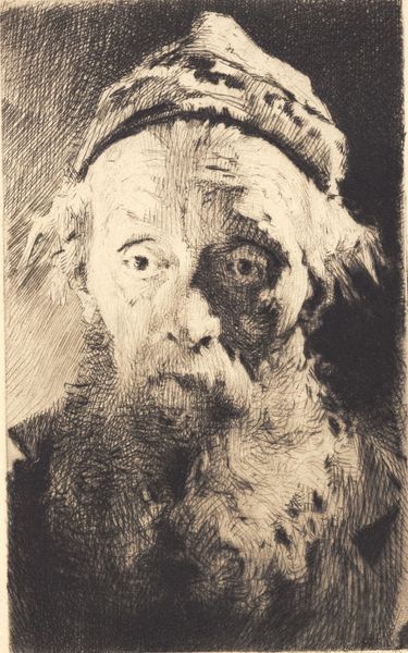 Curator: Well, this looks like a soul-searcher, doesn’t it? This etching, crafted in 1898 by Frans Schwartz, is titled "Gammel skægget mand, der ser til siden," or "Old bearded man looking to the side." Editor: Yes, there's something weighty about this one. It feels melancholic, almost mournful. The monochrome palette definitely contributes to that. And that texture—rough, like the character’s life etched onto the plate itself. Curator: It's certainly striking how the medium echoes the subject. Etching is such a process of controlled decay, really. What kind of cultural echoes do you perceive coming through from it? Editor: Decay is a beautiful word for it! The lines aren’t just lines—they’re little stories, little scars maybe. There is something biblical about his age and expression—like a weary prophet who has seen too much. The Realism gives him such a stark sense of truth, doesn't it? Curator: Absolutely. And think about what it meant to portray age and experience with such raw honesty at the end of the 19th century. A period of great transformation and societal reckoning. What kind of personal effect do you think it has on the viewers, then? Editor: For me, it prompts reflection. This guy looks like he is grappling with something internal. And he invites you into that space of introspection. We project, I think. Is that his sorrow, or our own reflected back at us? It's pretty powerful stuff for a black and white etching. Curator: A conversation across time, perhaps. Schwartz captured a timeless element of human existence. It reminds us, ultimately, of shared mortality and interiority. Editor: Yes, in a few lines he managed to remind us that our burdens and vulnerabilities are deeply interconnected across time and history. Curator: And, perhaps, gives us solace knowing we’re not so alone in facing them. Editor: A rather gloomy, but profound realisation. I think I need a coffee now.