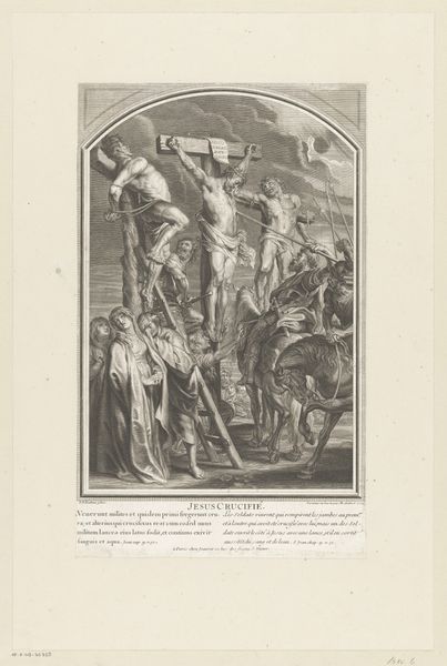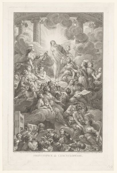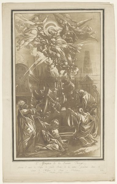 This print by Joannes van den Sande depicts the Apotheosis of the Martyrs of Gorkum. At first glance, the composition draws the eye upward through layers of figures set amongst billowing clouds, illuminated by a divine light. The artist employs a distinct visual hierarchy, structuring the scene into earthly and heavenly realms. Note how the lines of sight and gestures converge towards the apex, where the Holy Spirit shines. The use of light and shadow creates a dynamic contrast, almost theatrical in nature. This interplay is crucial, as it not only directs our focus, but also infuses the scene with symbolic weight. Consider how the arrangement might suggest a semiotic ladder, where each figure and gesture serves as a signifier within a broader narrative of martyrdom and divine grace. It functions as a visual metaphor for the ascent of the soul through faith, where the formal elements of the image are skillfully arranged to evoke a sense of transcendence.