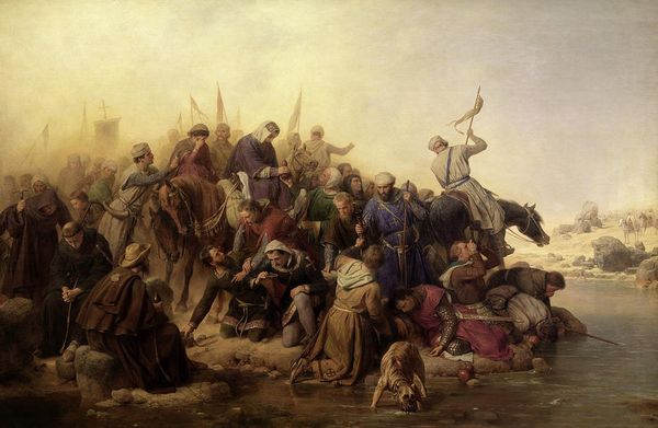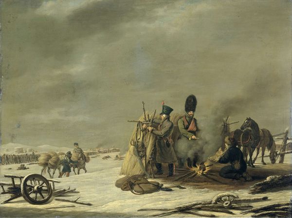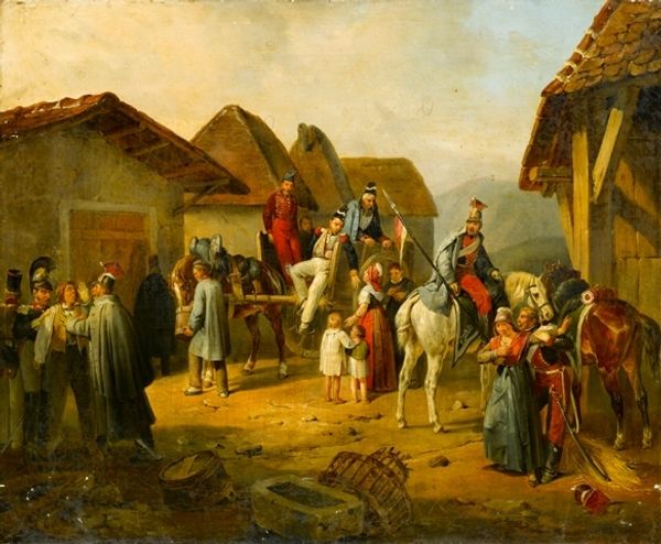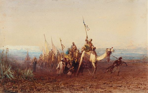 Ippolito Caffi painted this view of Rome’s Via Appia at dawn to explore the structural interplay between light, form, and historical narrative. Notice how the composition is divided horizontally, the cool blues of the sky and the warm yellows of the rising sun form a liminal space. Caffi uses light not just to illuminate but to give shape to the ancient ruins and the figures populating the scene. The ruins, rendered with a crumbling texture, stand as silent witnesses to the passage of time, their forms echoed in the figures journeying along the road. The figures move away from the ruins and into the light, suggesting a break from the old towards something new. Consider how the contrast between the solid forms of the past and the transient figures contributes to the picture's overall meaning. The juxtaposition isn’t just aesthetic; it's a cultural dialogue about Italy’s past and future. The painting invites us to consider how we engage with history.