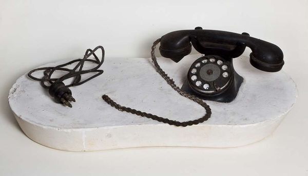 Editor: So, here we have an early 1930s American artwork, an anonymous “Telephone-still bank,” comprised of metal and pigment and perhaps other found materials. It's playful but also carries a certain gravity, doesn't it? What significance do you see in such an object? Curator: It speaks volumes about aspirations, doesn’t it? Notice how this everyday object is transformed into a symbol of financial security. A telephone wasn’t as ubiquitous as it is today. Owning one symbolized connection, progress. And combined with a “bank”…it highlights an intersection between communication and economic power in the US during that period. Editor: Interesting! So the form is a common, accessible item, the telephone. Is there anything about the image that changes how it operates as a symbolic form? Curator: Note its charming obsolescence, too. That dial! Today a touch screen mediates communication. But look more deeply. That lovely red. The worn patina. These remind us how technology mediates relationships with others, a phenomenon still current today. Doesn’t the patina also evoke nostalgia, a longing for simpler, supposedly safer times? It carries many emotions within a seemingly simple design, doesn't it? What did you first notice? Editor: Well, I think the way the colours wear, revealing that the metal it's constructed of isn’t so solid…suggests that these modern tools and institutions are less secure and reliable than they appear on the surface. I suppose the 'bank' label adds to that now! Curator: Exactly. Visual elements enhance the metaphoric strength of a familiar object. What have we discovered? This "telephone-still bank” does far more than offer communication or safekeeping; it reveals shared cultural ideals and anxieties regarding societal systems still resonant now. Editor: So even a child's toy embodies complex meanings and can evoke emotions rooted in historical contexts. I’ll definitely look at these types of objects differently now.