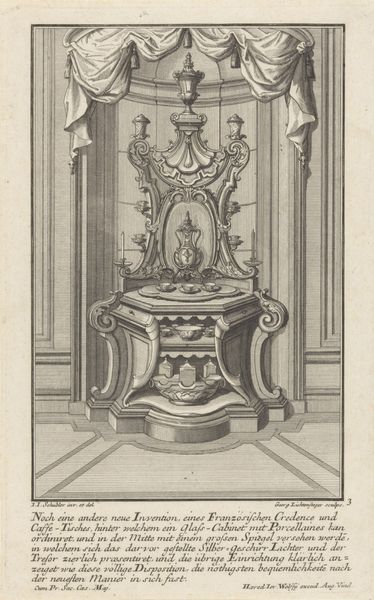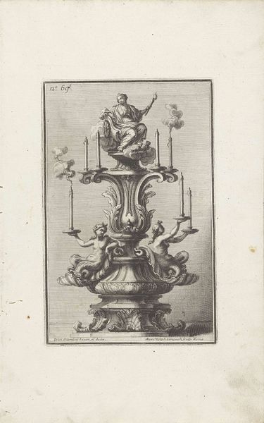 This engraving shows a hexagonal basin on an elevation with stairs. Though made by an anonymous artist, its intricate structure and decorative elements offer a glimpse into the aesthetic sensibilities of its time. Notice how the artist meticulously renders the fountain's multi-tiered structure, emphasizing its geometric precision and symmetry. The choice of a hexagonal shape for the basin immediately signals a departure from more conventional forms, suggesting an interest in complexity and innovation. The figure of Hercules atop the fountain is not merely decorative but becomes a focal point through which the viewer is invited to consider power, mythology, and their representation in art. The composition creates a visual hierarchy, where each level of the fountain contributes to an overarching sense of order and balance. This careful arrangement is characteristic of formalist approaches that value structural integrity and visual harmony, creating a dialogue between form and meaning.