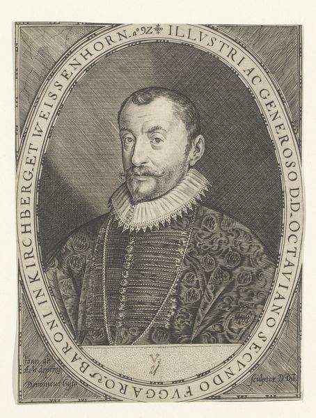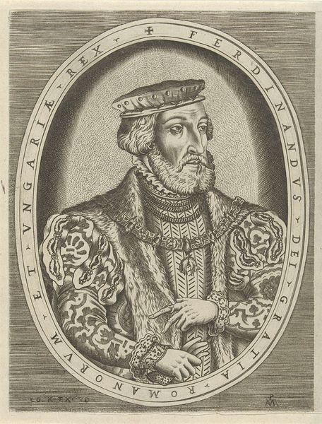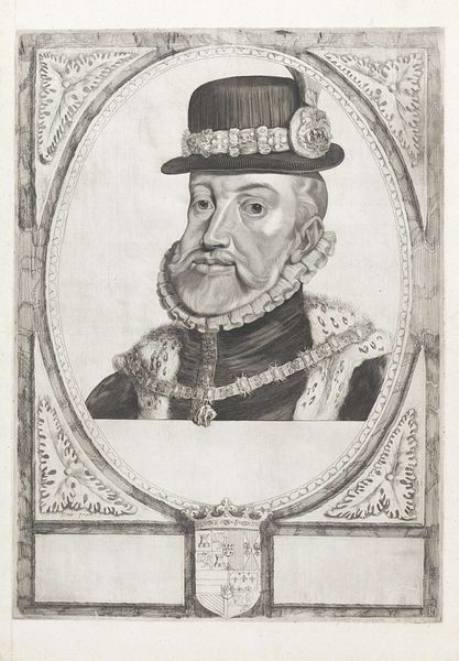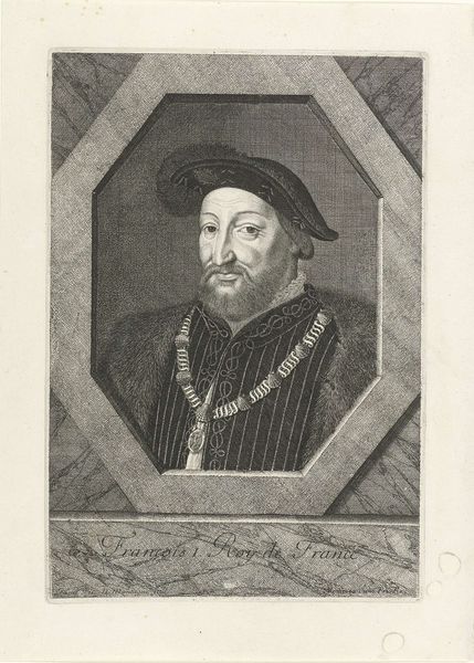 This is Jean Morin's engraving of Henri II, King of France, created around the mid-17th century, now residing at the Metropolitan Museum of Art. Notice how the stark contrast between light and shadow defines the contours of Henri’s face and the elaborate patterns of his attire. The octagonal frame, with its sharp, geometric lines, encases the figure, creating a structured space that both confines and elevates the subject. The lines of the engraving emphasize texture, from the soft feather in Henri's hat to the intricate embroidery of his doublet, which reflects the opulence and detail characteristic of the era's aristocratic portraiture. The semiotic weight of this portrait lies in its careful construction of royal identity. Every line and shadow serves to project an image of power and sophistication, while the frame acts as a boundary, setting the royal figure apart from the mundane world. Ultimately, Morin's skillful use of engraving techniques transforms a portrait into a powerful symbol of authority, demonstrating how form and structure can communicate complex ideas about status, identity, and representation.